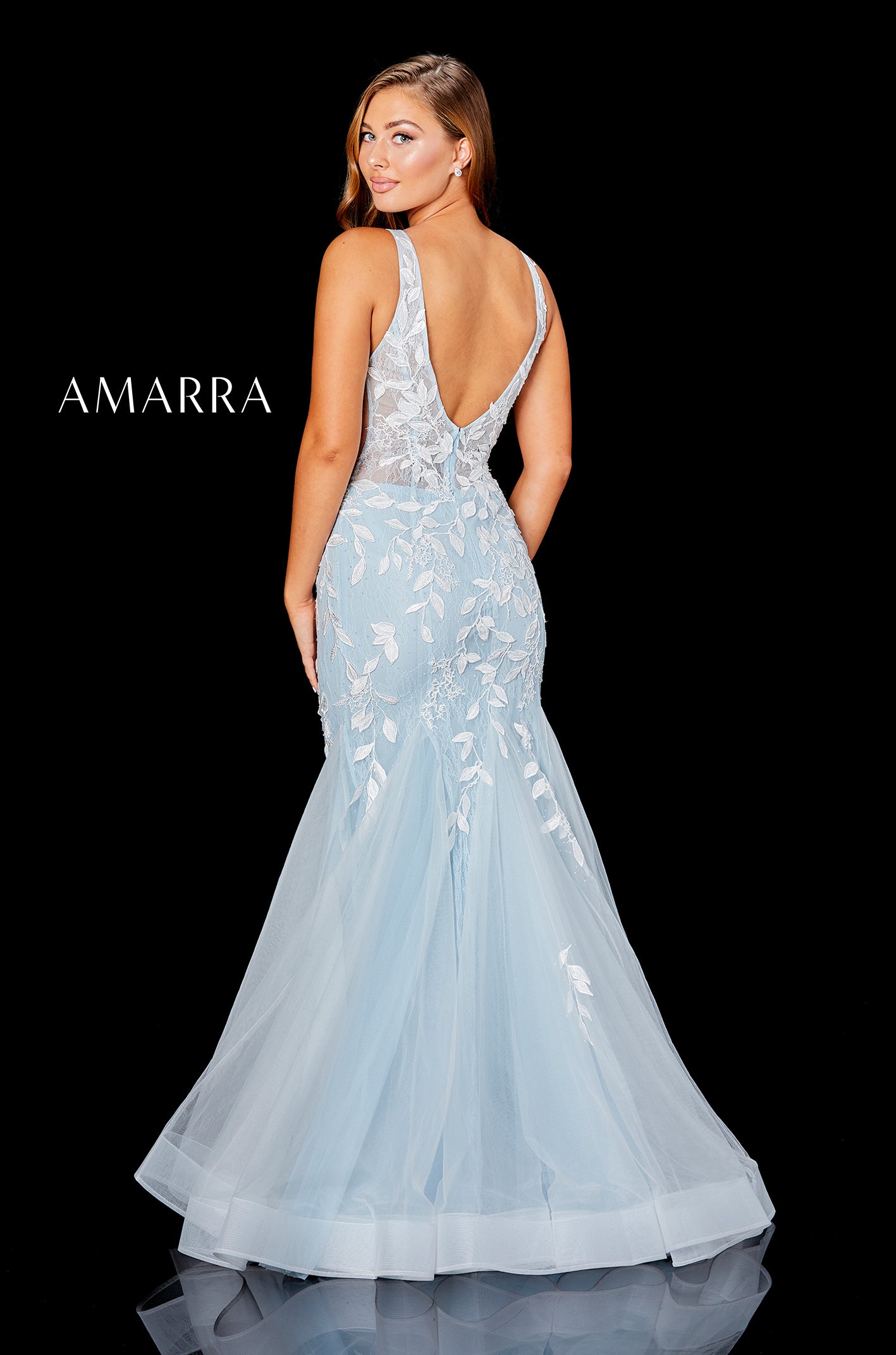 Amarra 20180 Embellished lace fit and flare gown with a plunging V-neck and open back.
