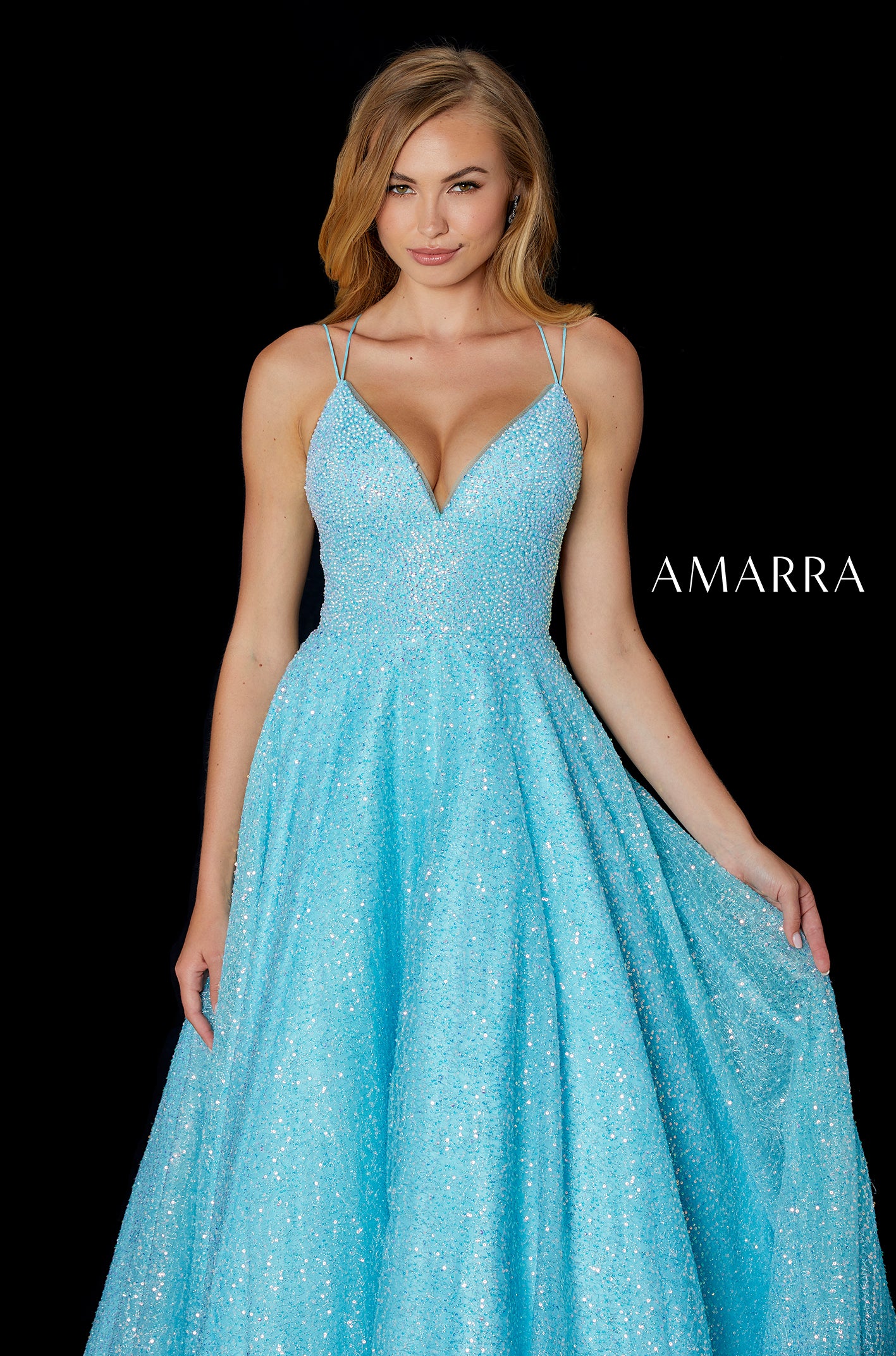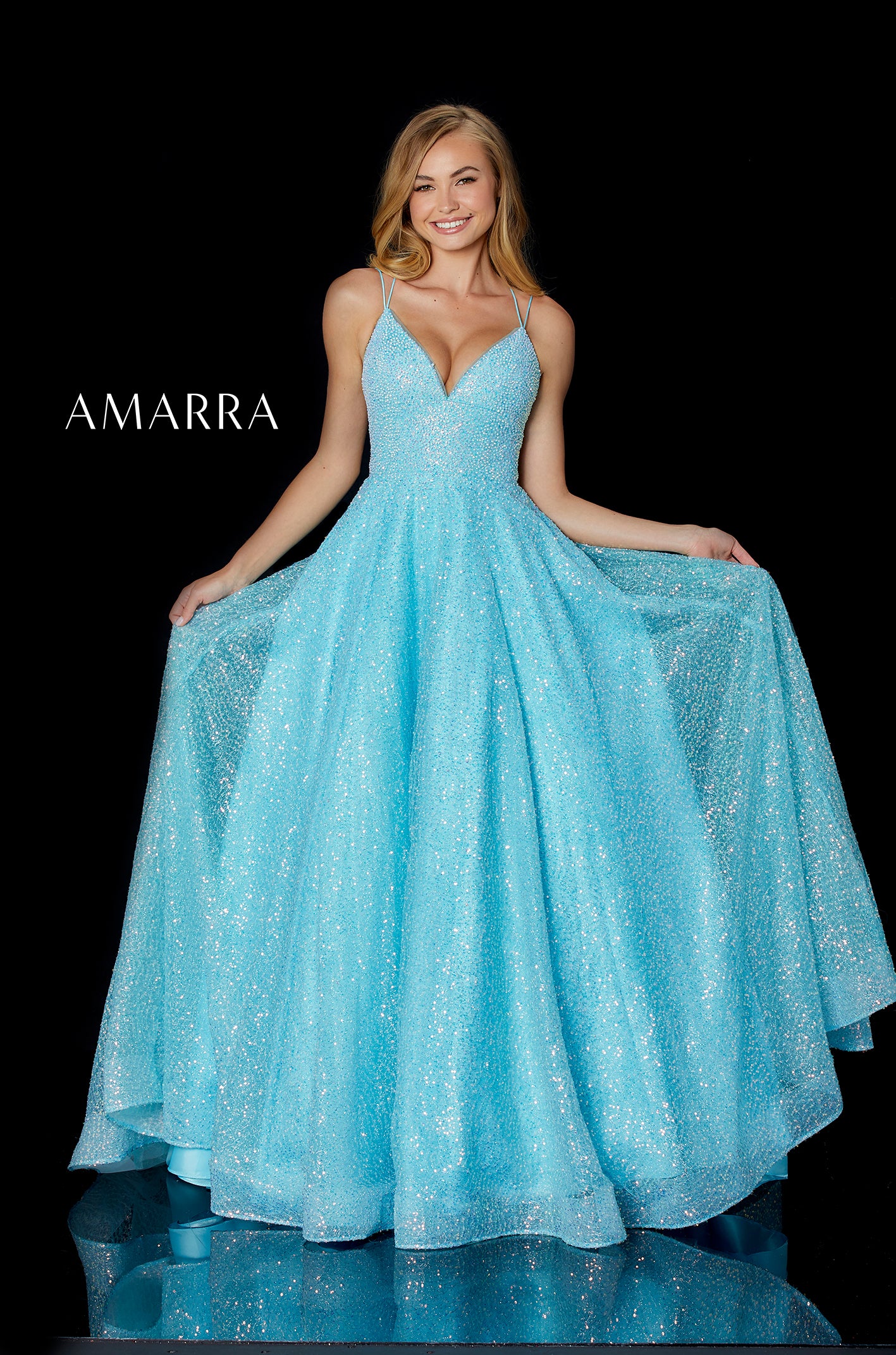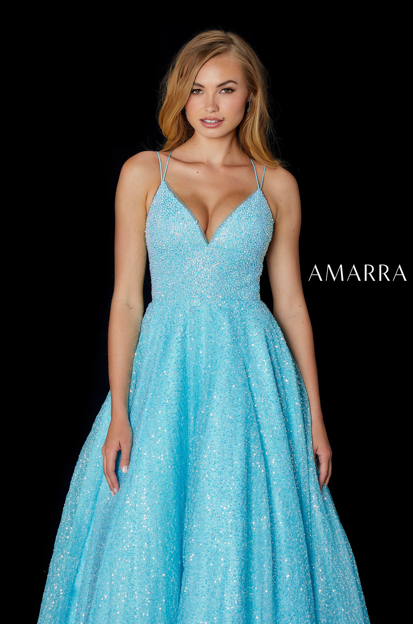Amarra 87312 shimmering aqua spaghetti straps with crossing back straps. Also available in: Ivory & Lilac
