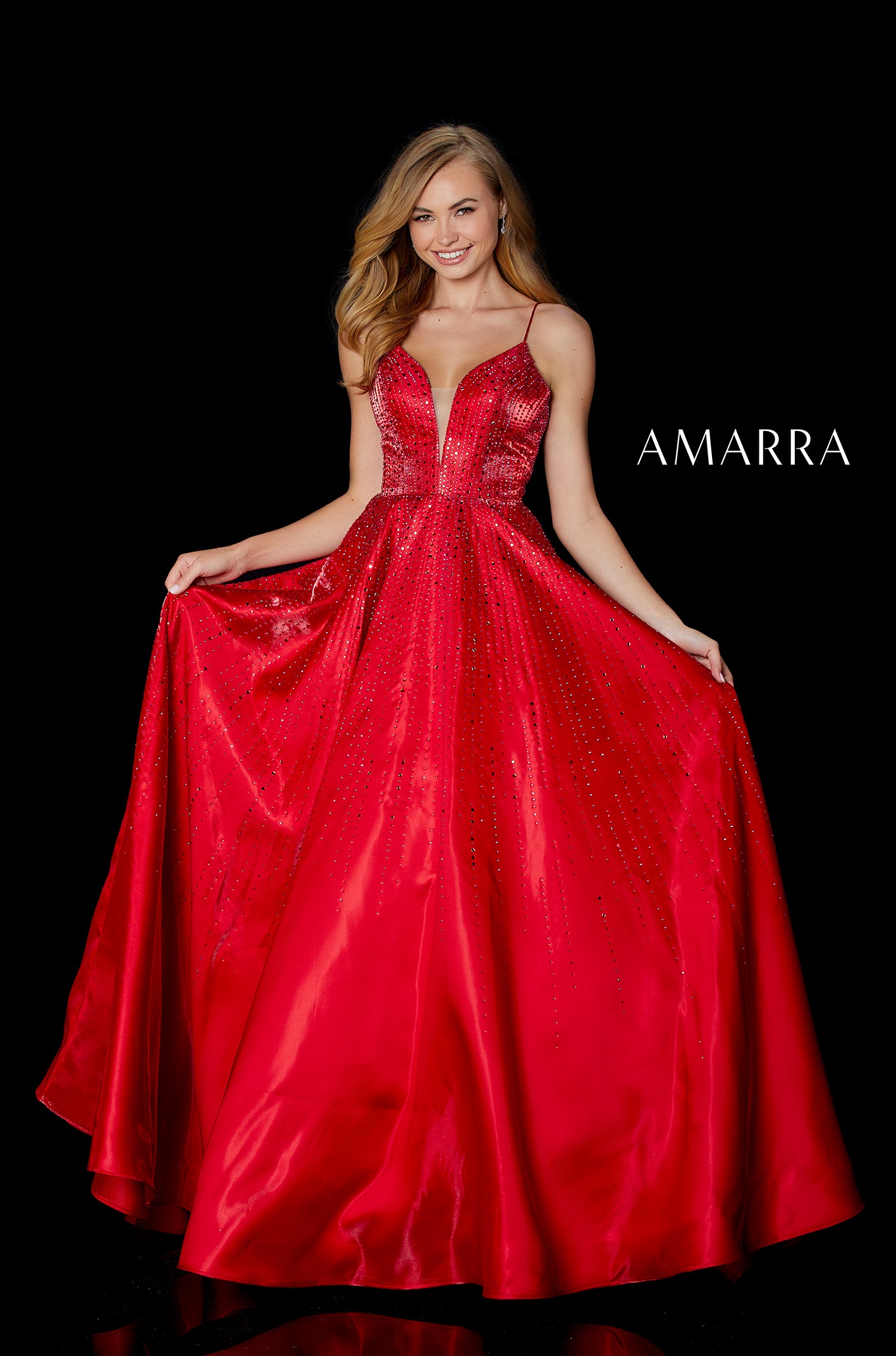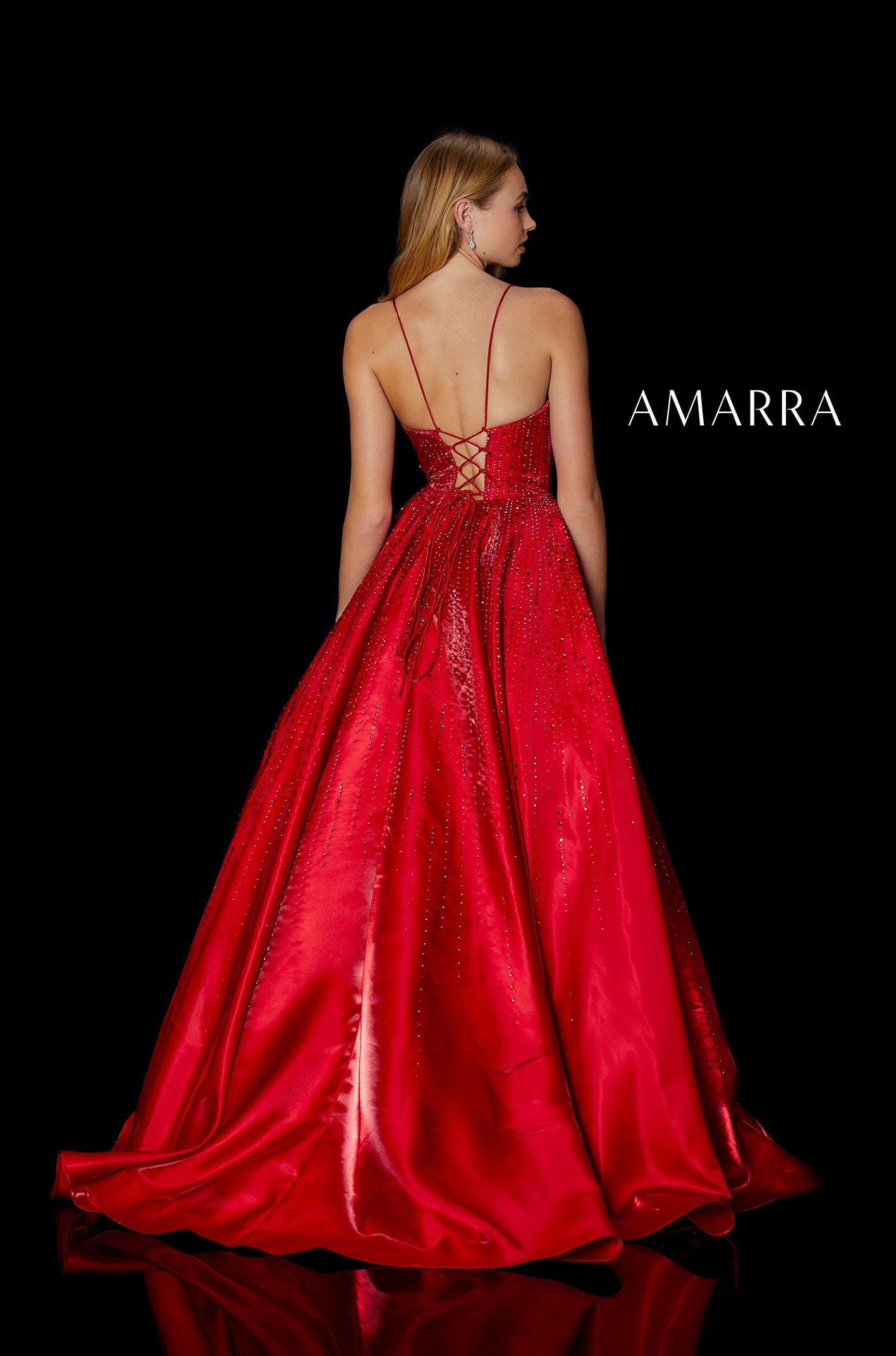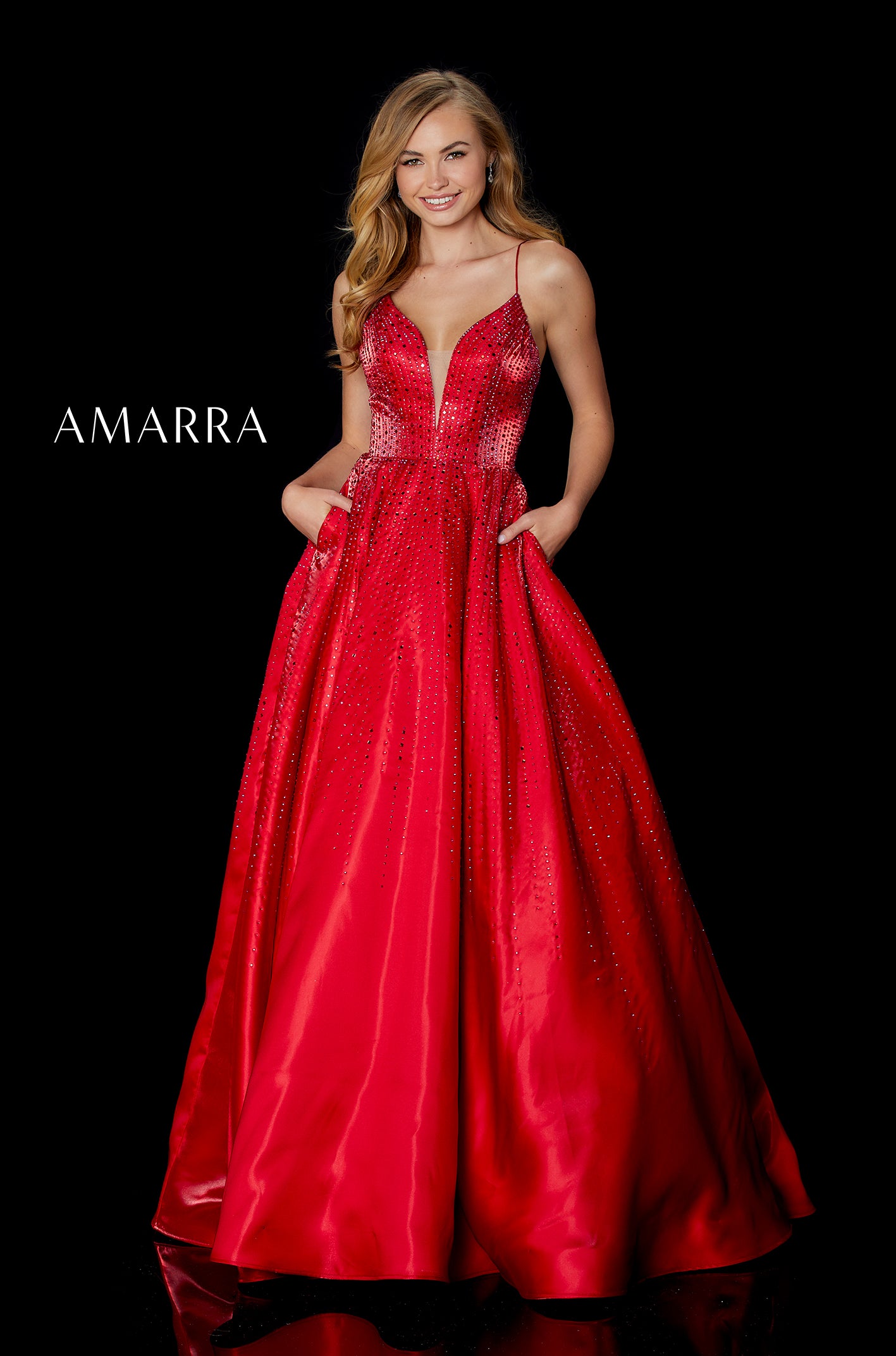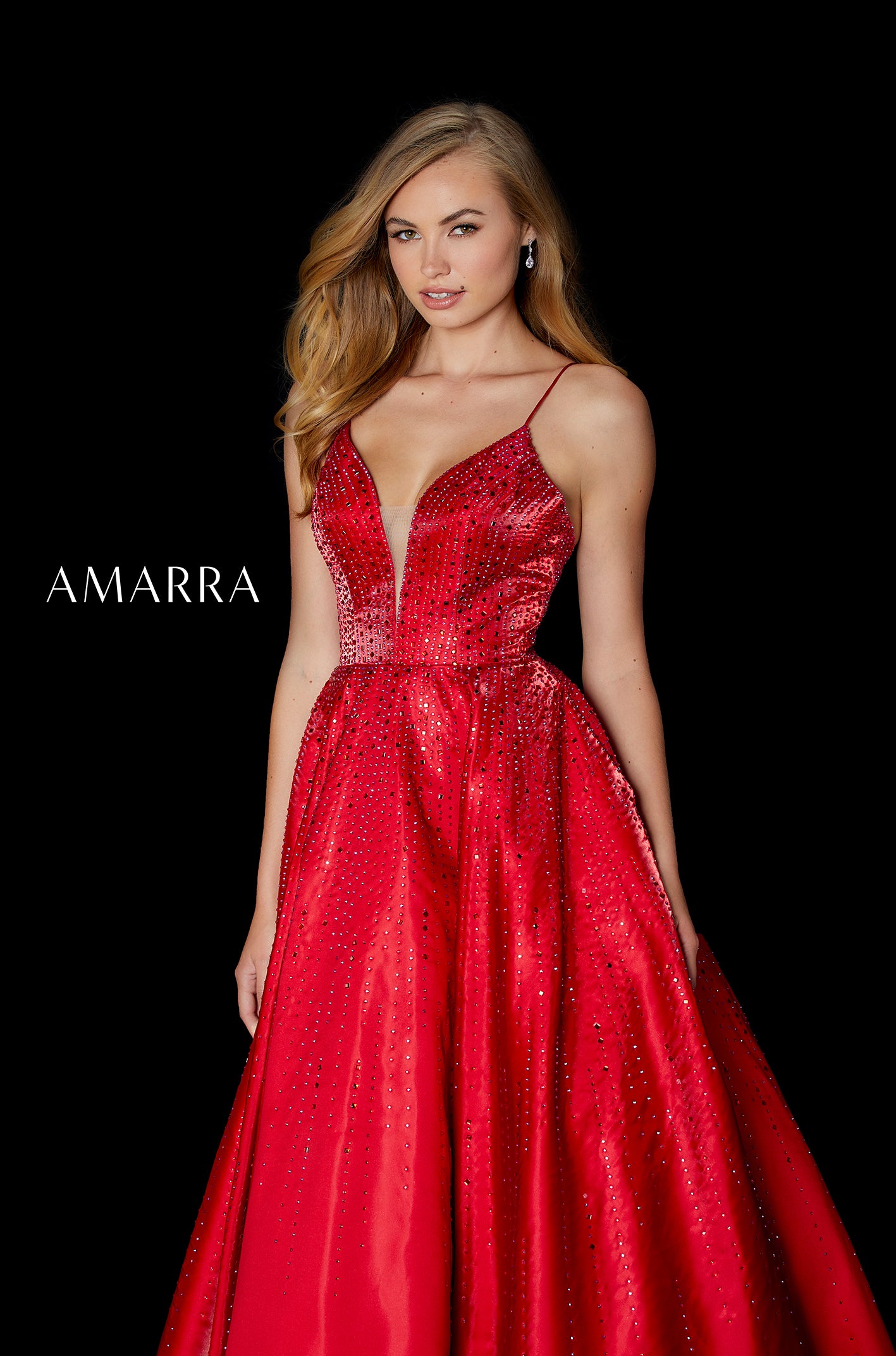 Amarra 87327 shimmering red spaghetti straps long dress.