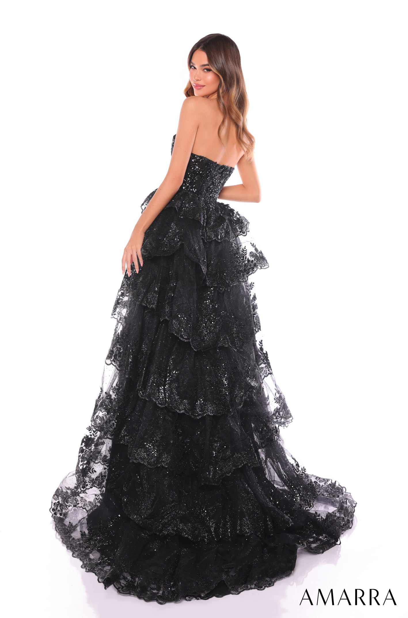 Elevate your evening ensemble with this luxurious gown tailored for the most prestigious affairs. This enchanting dress features a strapless bodice adorned with dazzling embellishments that effortlessly catch the light. The gown's silhouette gently cinches at the waist before gracefully cascading into a multi-layered, ruffled skirt, each layer adorned with the same sparkling accents for a harmonious finish. A chic thigh-high slit on the left side adds a touch of allure, making this gown a sophisticated choice for any formal occasion.