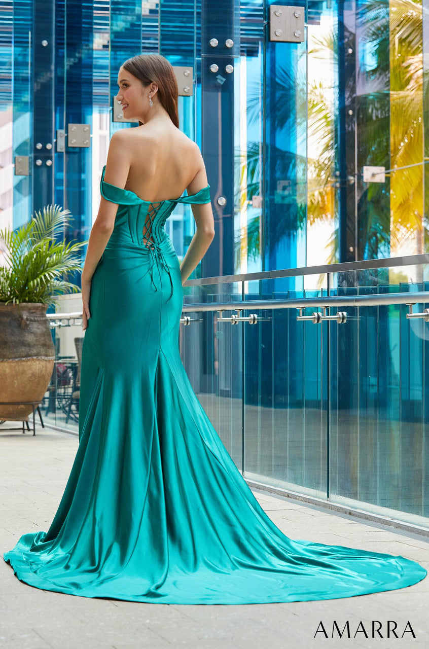 Amarra 88653 Off the shoulder silky stretched satin gown with corset top, lace up back, and slit.