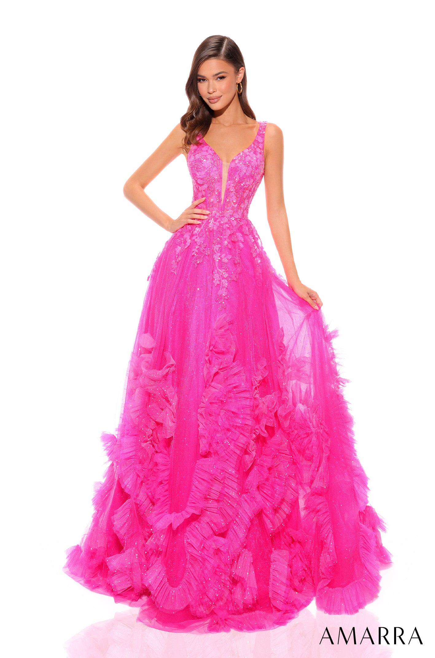 Elegant A-line gown made from sparkling tulle with a plunging V-shaped neck, ruffled tulle hem, Basque waistline, open v-back and sweep train.