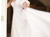 The Willow Gown is a romantic bridal gown features beautifully appliqued leaf motif, A-line and detachable puff sleeves worthy of medieval princess. Perfect for sweet brides looking an outdoor wedding gown, it features elongated back skirt for the most gorgeous photoshoots.