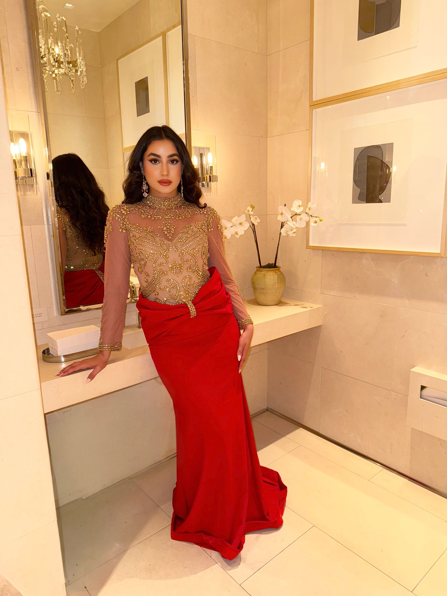 Channel your inner Hollywood glam in this jaw-dropping evening gown. The fitted bodice is crafted from sheer, nude mesh and lavishly embroidered with swirling gold beadwork, tracing an opulent high chocker neckline and full-length sleeves for a regal, “barely there” effect. The stretch crepe cinches into a dramatic, draped bow detail before cascading into a floor-skimming, mermaid-style hem.