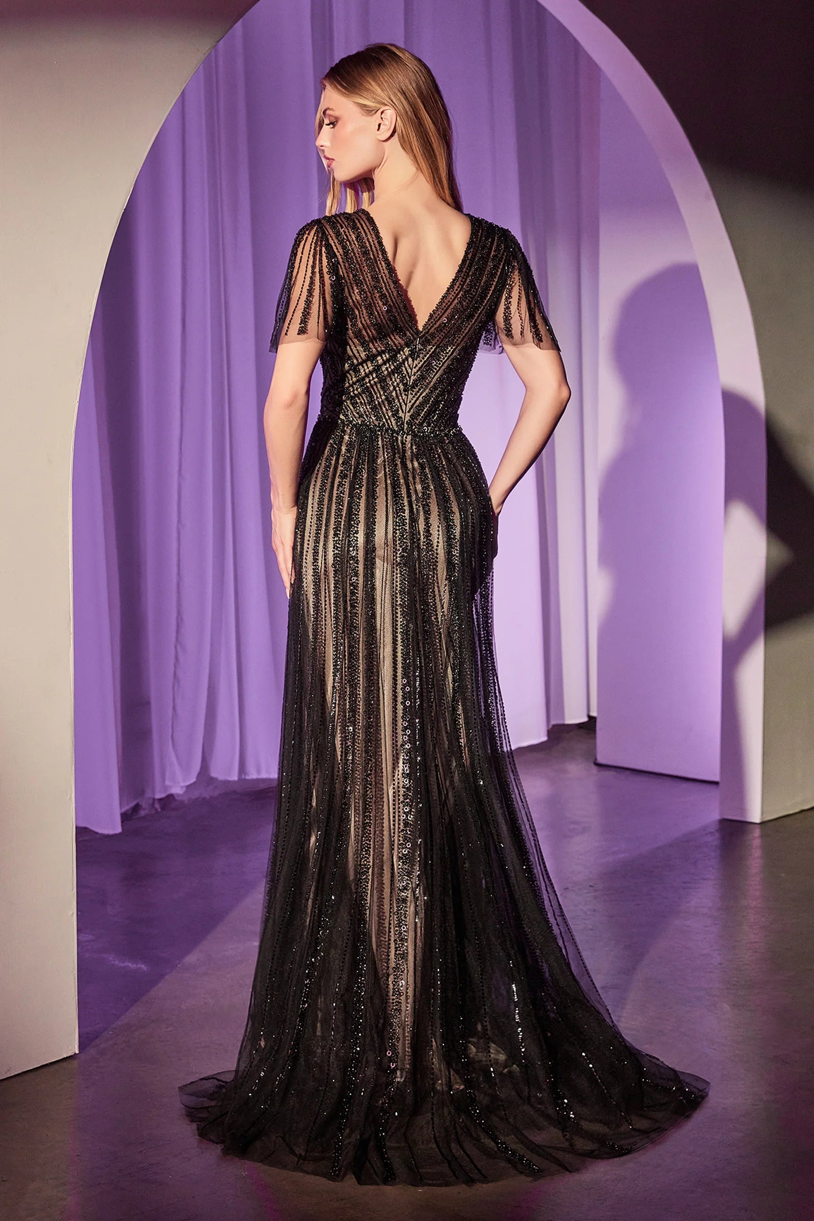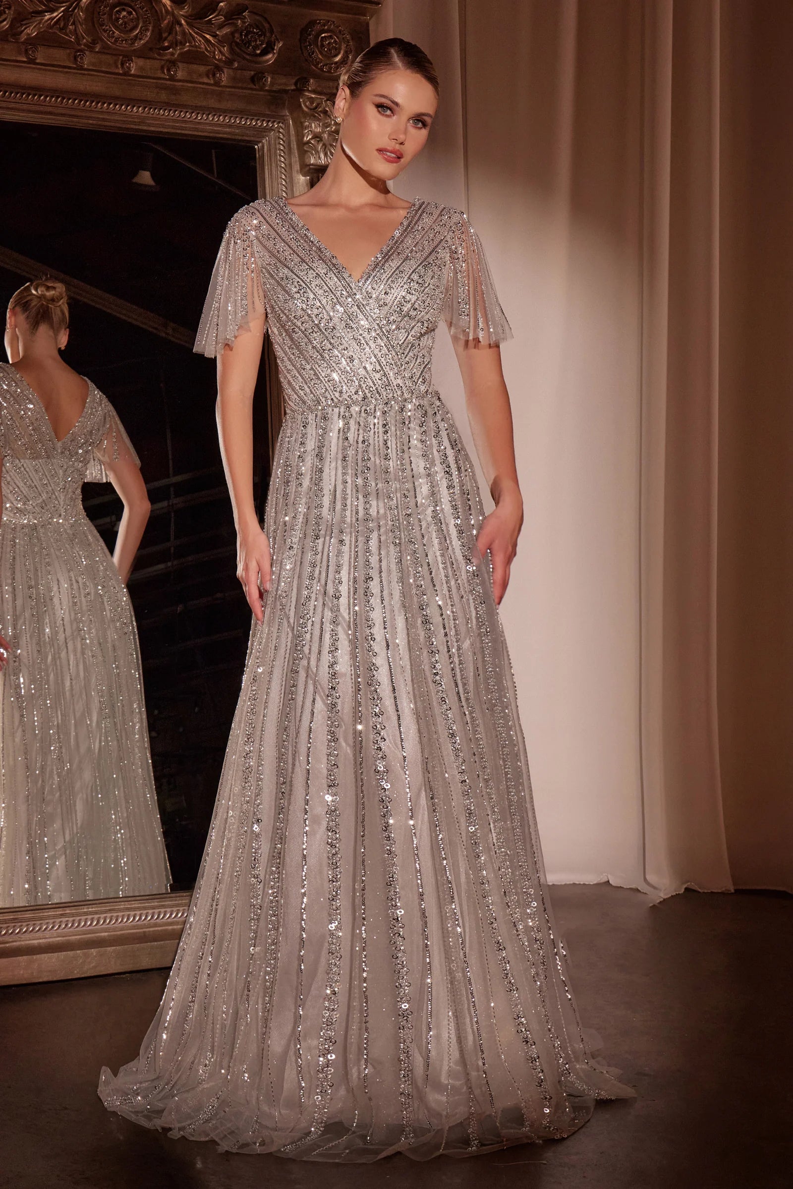 Elevate your elegance with this enchanting A-line dress, featuring a flattering V-neckline and charming short butterfly sleeves adorned with a linear beaded motif. Crafted from pleated embellished tulle, the fitted bodice gracefully complements the soft A-line skirt for a sophisticated look. Perfect for modest formal events or as a stunning choice for the mother of the bride, this dress combines timeless style with exquisite details.