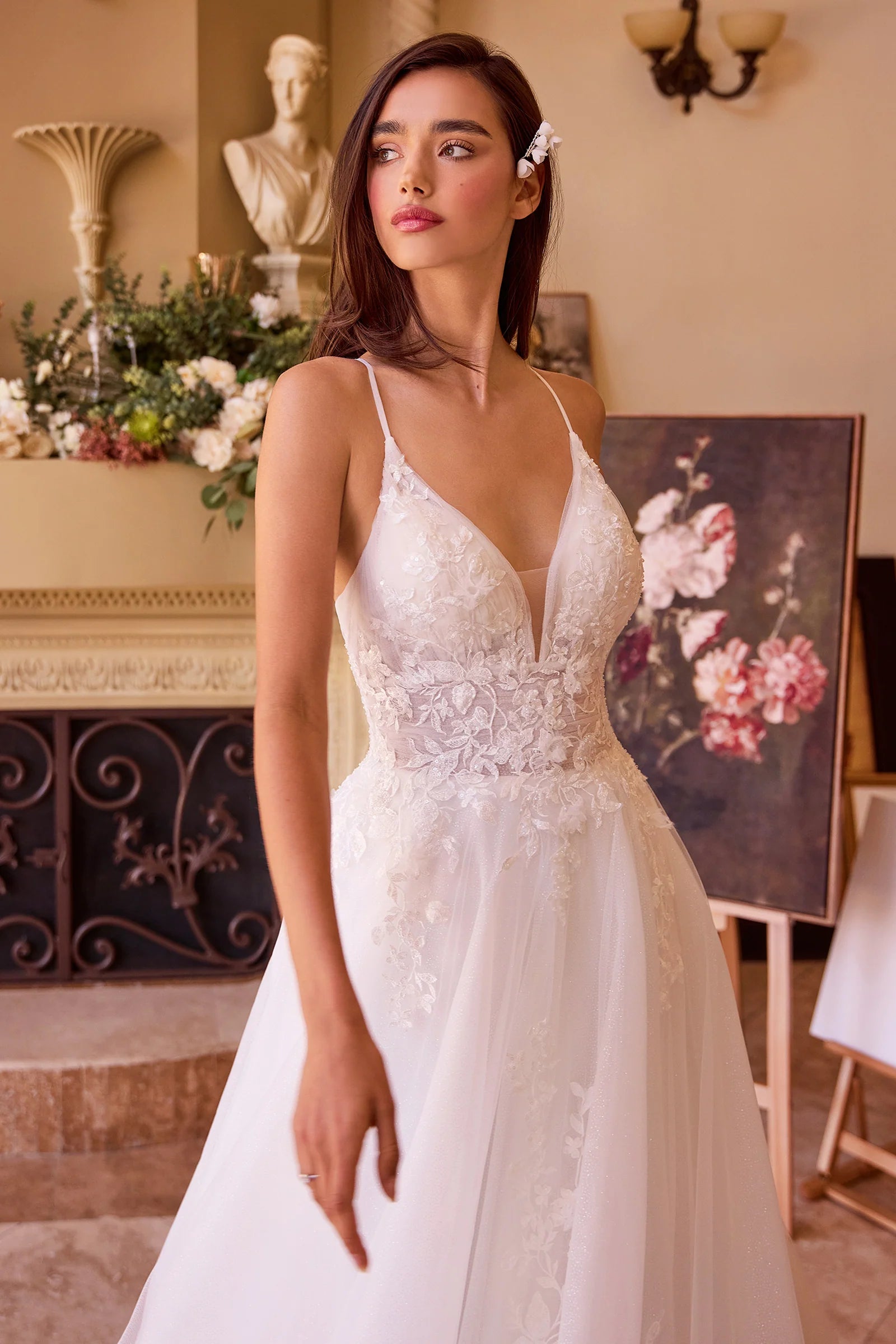 Step into elegance with this stunning A-line bridal gown, featuring a deep V-neckline and delicate thin straps that beautifully accentuate the lace bodice. The fitted waistline highlights your silhouette, leading to a flowing layered tulle skirt that adds a romantic touch. Perfect for weddings, this enchanting dress combines timeless charm with modern sophistication, ensuring you feel like a true bride on your special day.