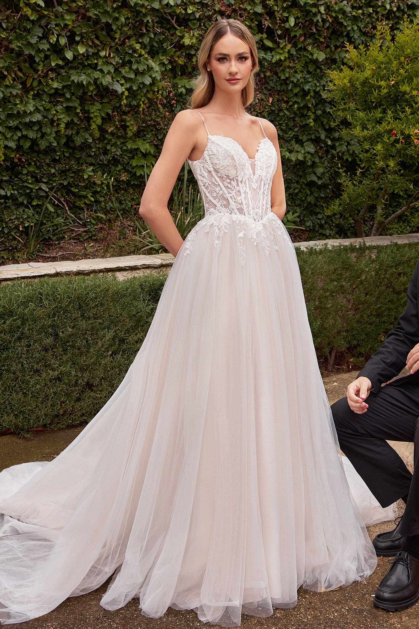 Shine like a diamond on your special day in this stunning tulle A-line bridal gown. Designed with a romantic appeal, the intricately appliqued lace bodice is framed by thin straps perfect for that demure touch. With sheer bodice and boning structure along with delicate feminine details, this dress will enhance your natural beauty for the most memorable day of your life. The full layered skirt of tulle cascades gracefully around your body while the lace-up corset back adds an enchanting accent to make you look and feel amazing. Make an unforgettable entrance on your wedding day in this gorgeous A-line bridal gown.