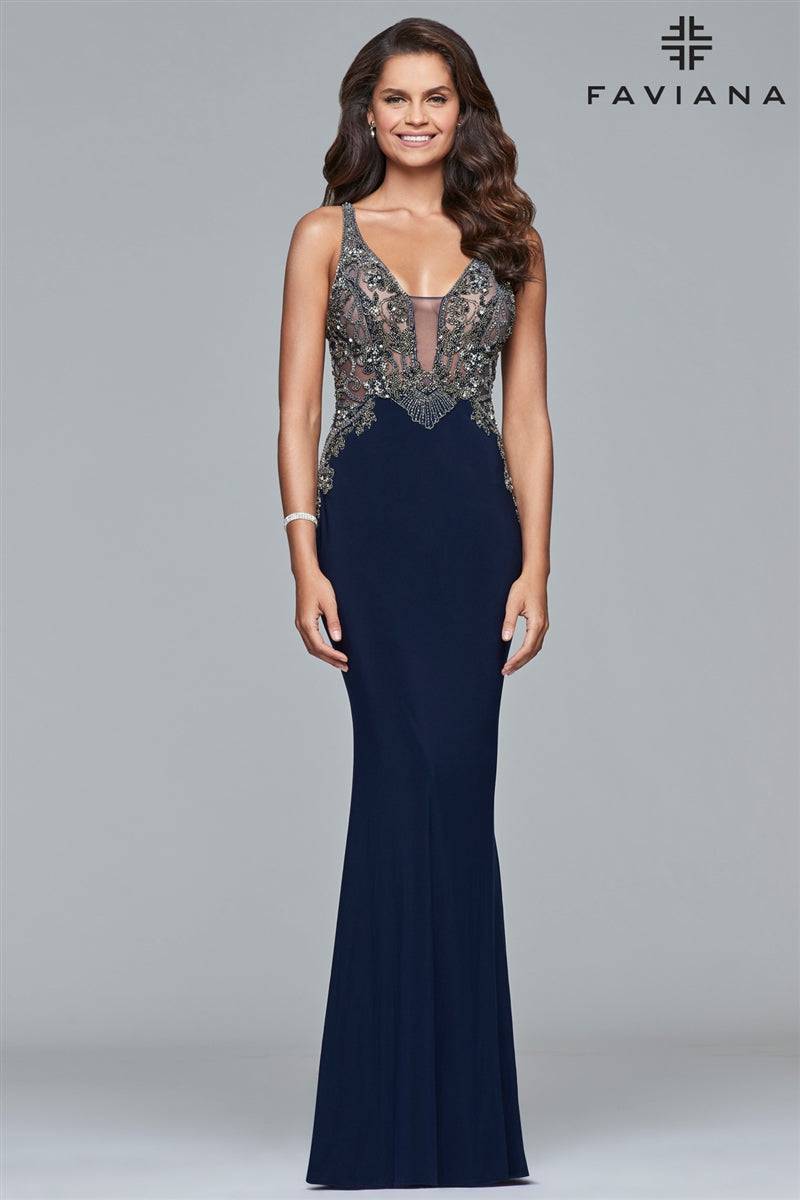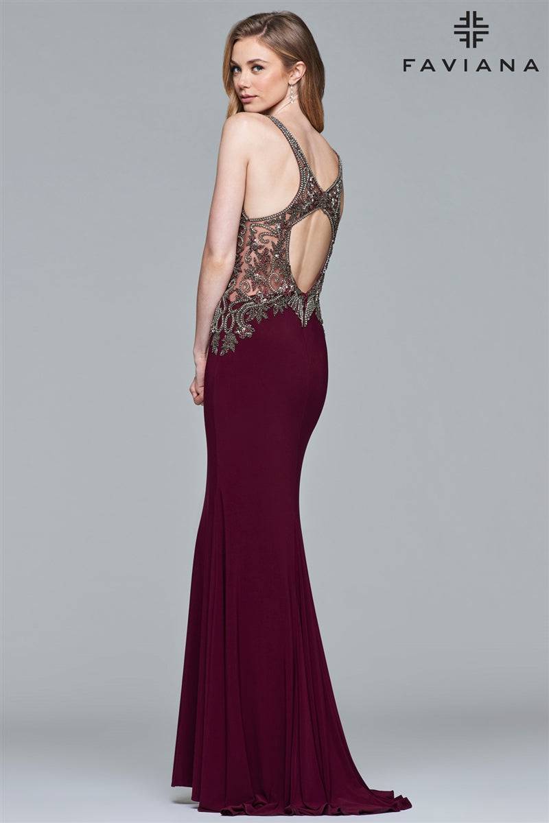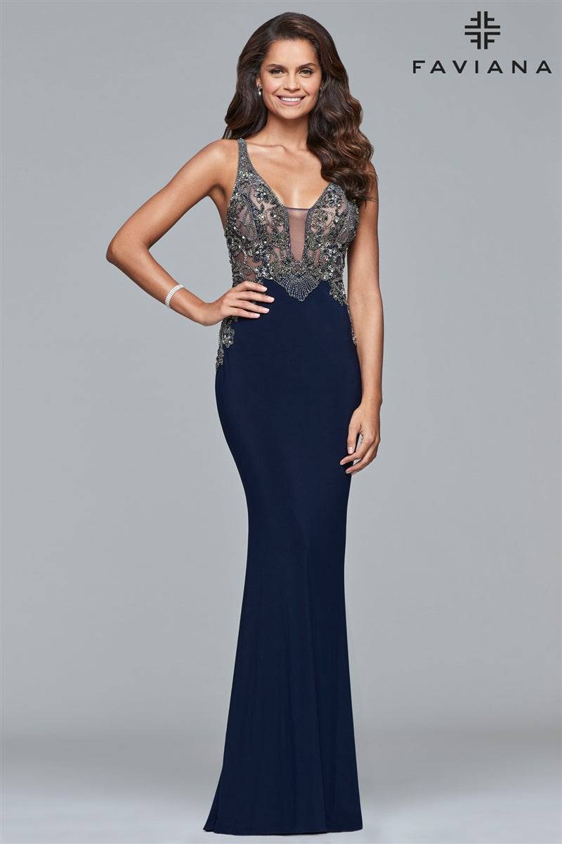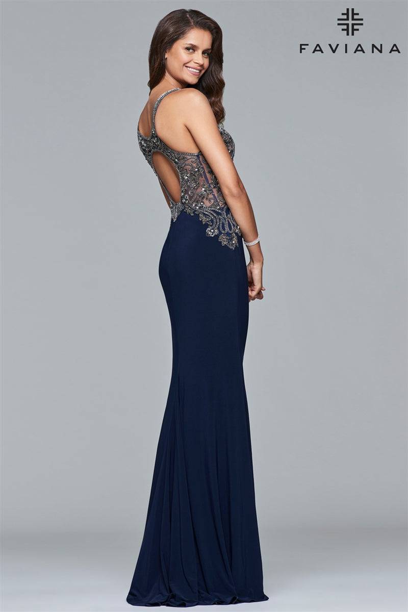 long fitted with straps and v-neck beaded, cut-outs and jersey prom dress.
