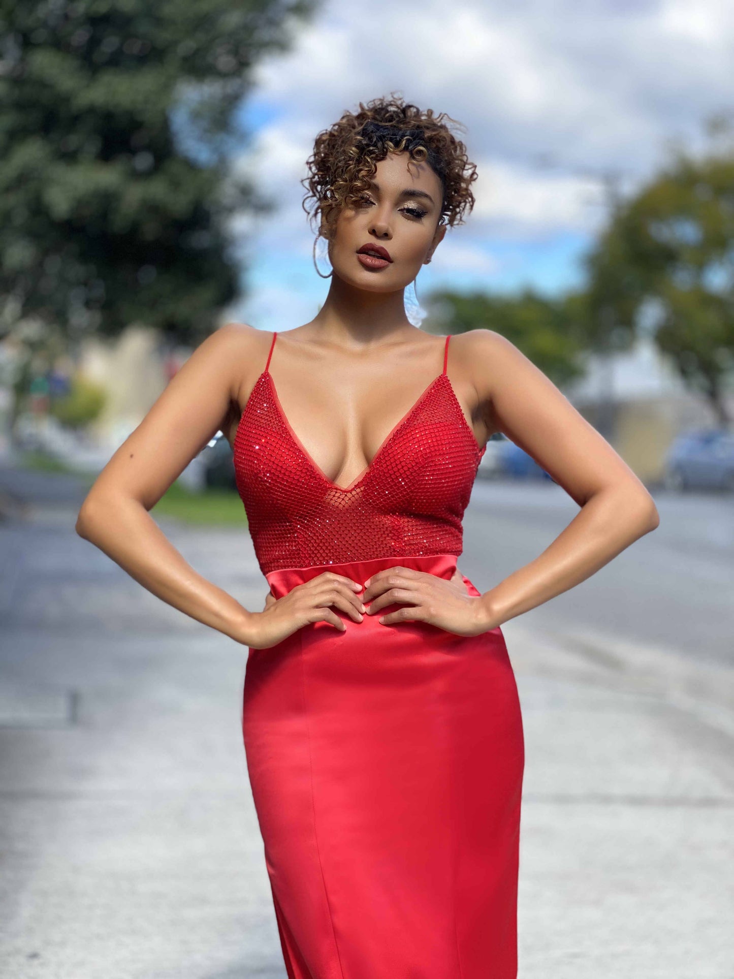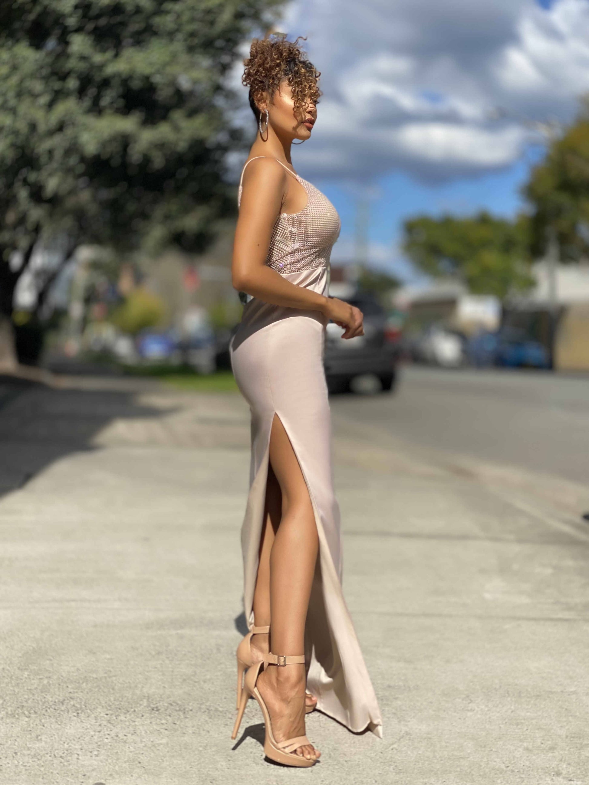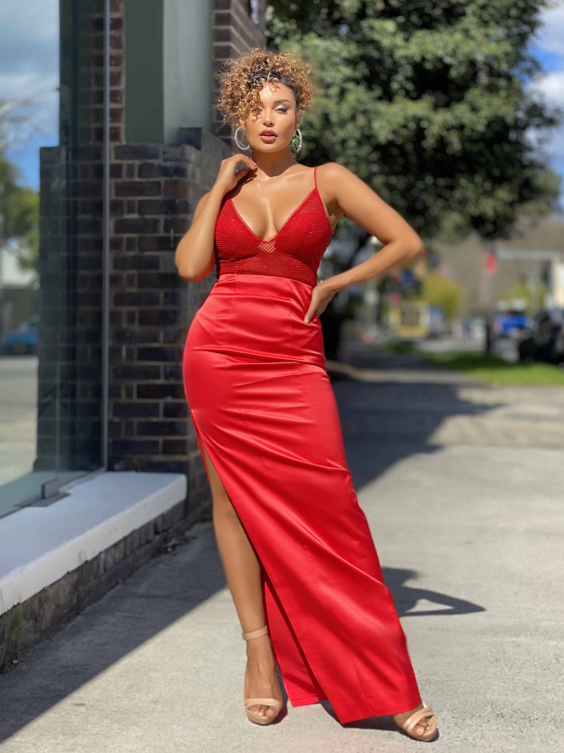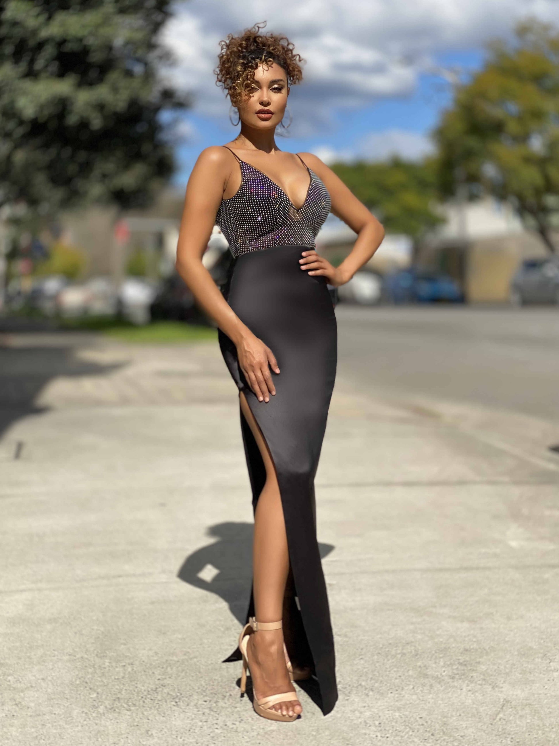 Jadore JX4061 black deep v-neckline with a low cut V back long dress has a sequence bodice with spaghetti straps, finished with a high side split. Also available in: Nude & Red