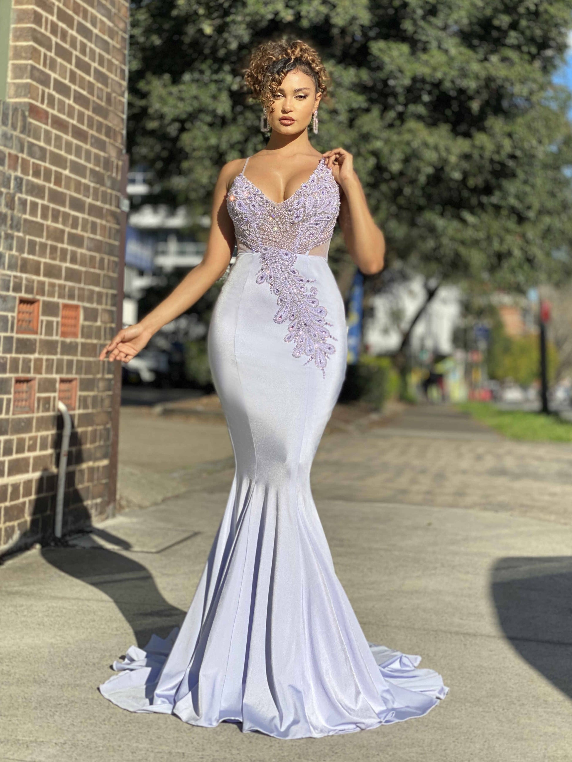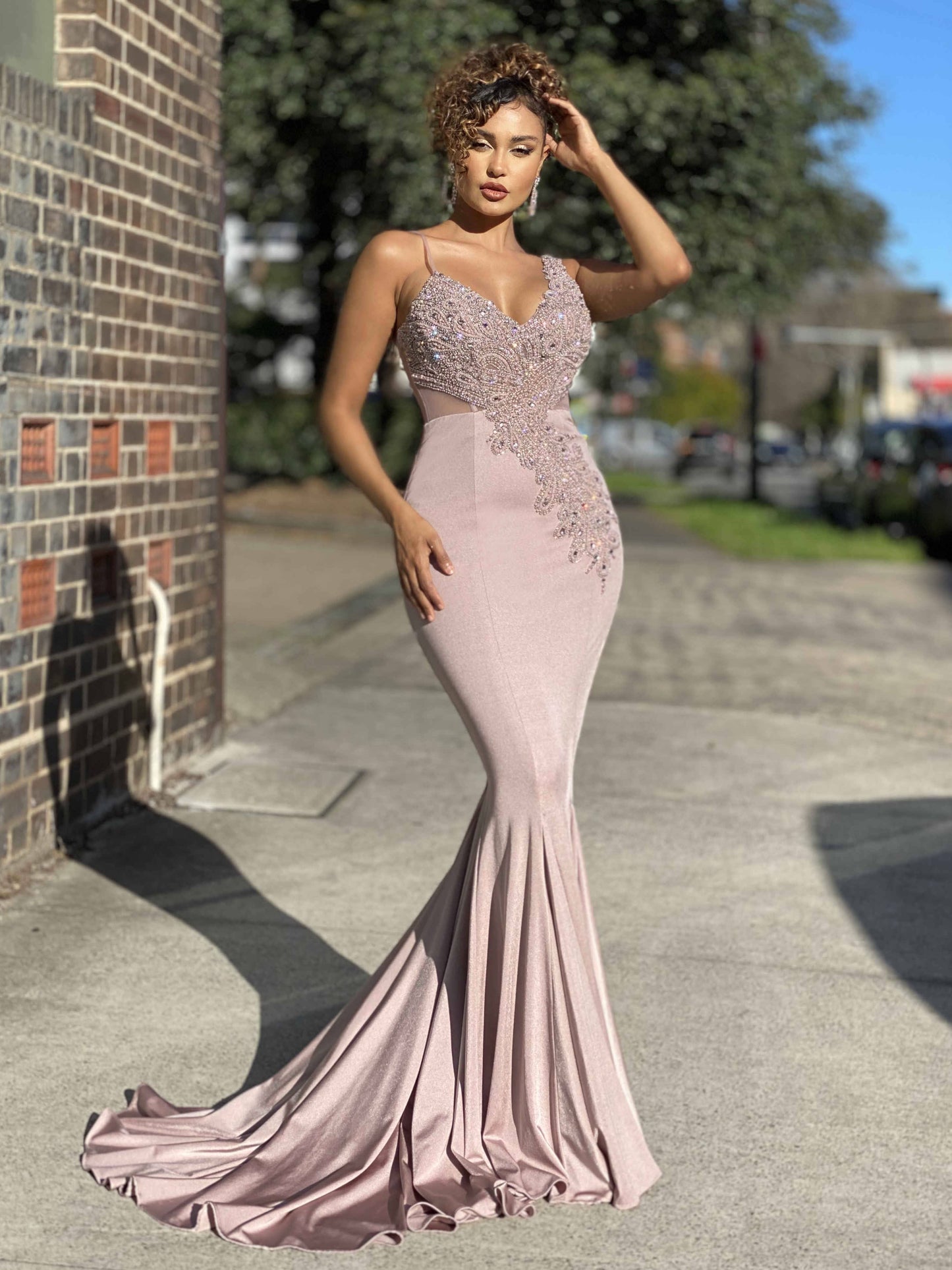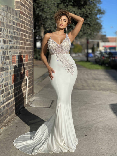 Jadore JX4073 ivory embellished sequin long dress with v-neckline and thin strap, cut out sheer panelling features on the waistline and continues through to the back of the dress. Also available in: Lilac & Mocha