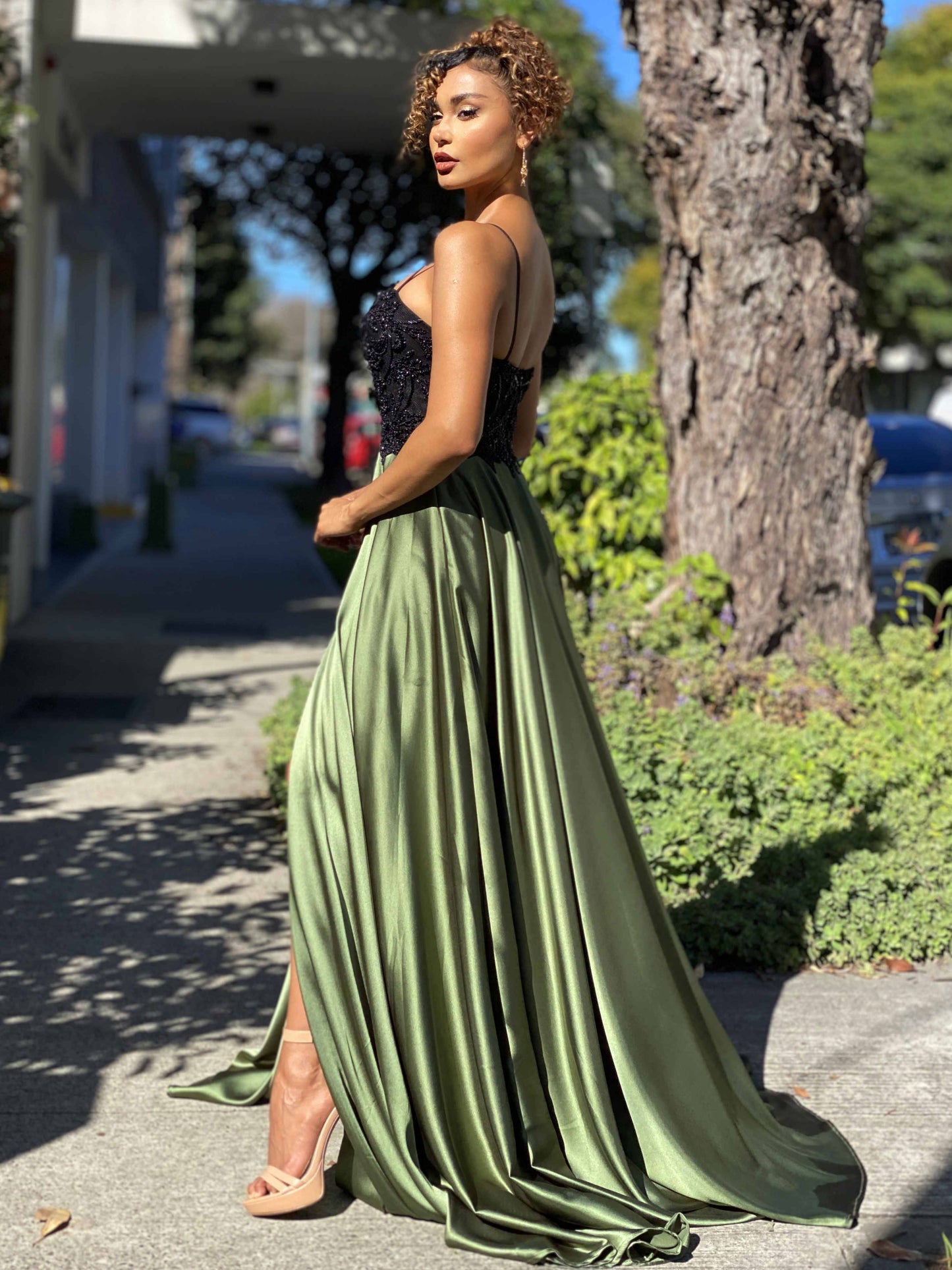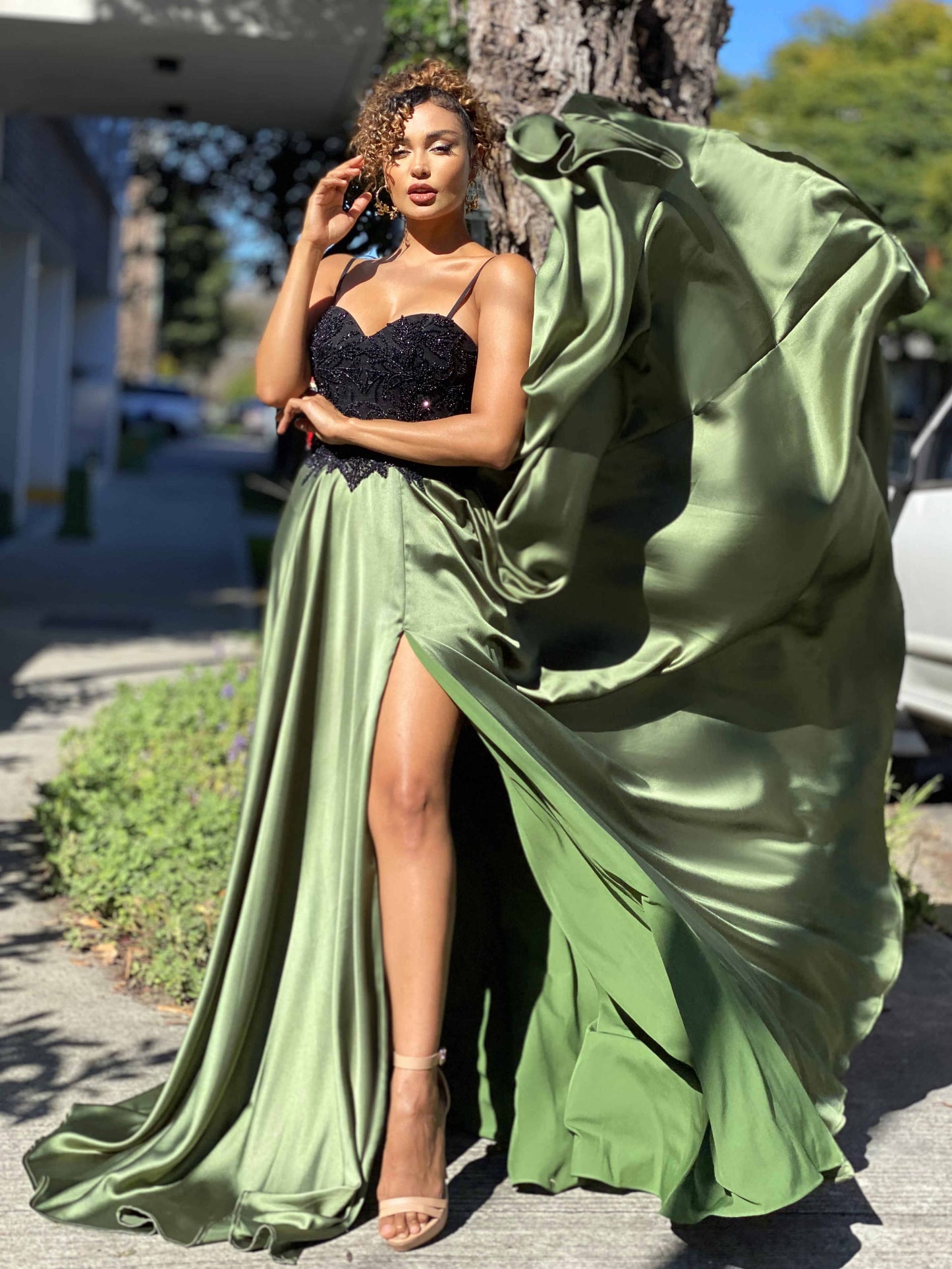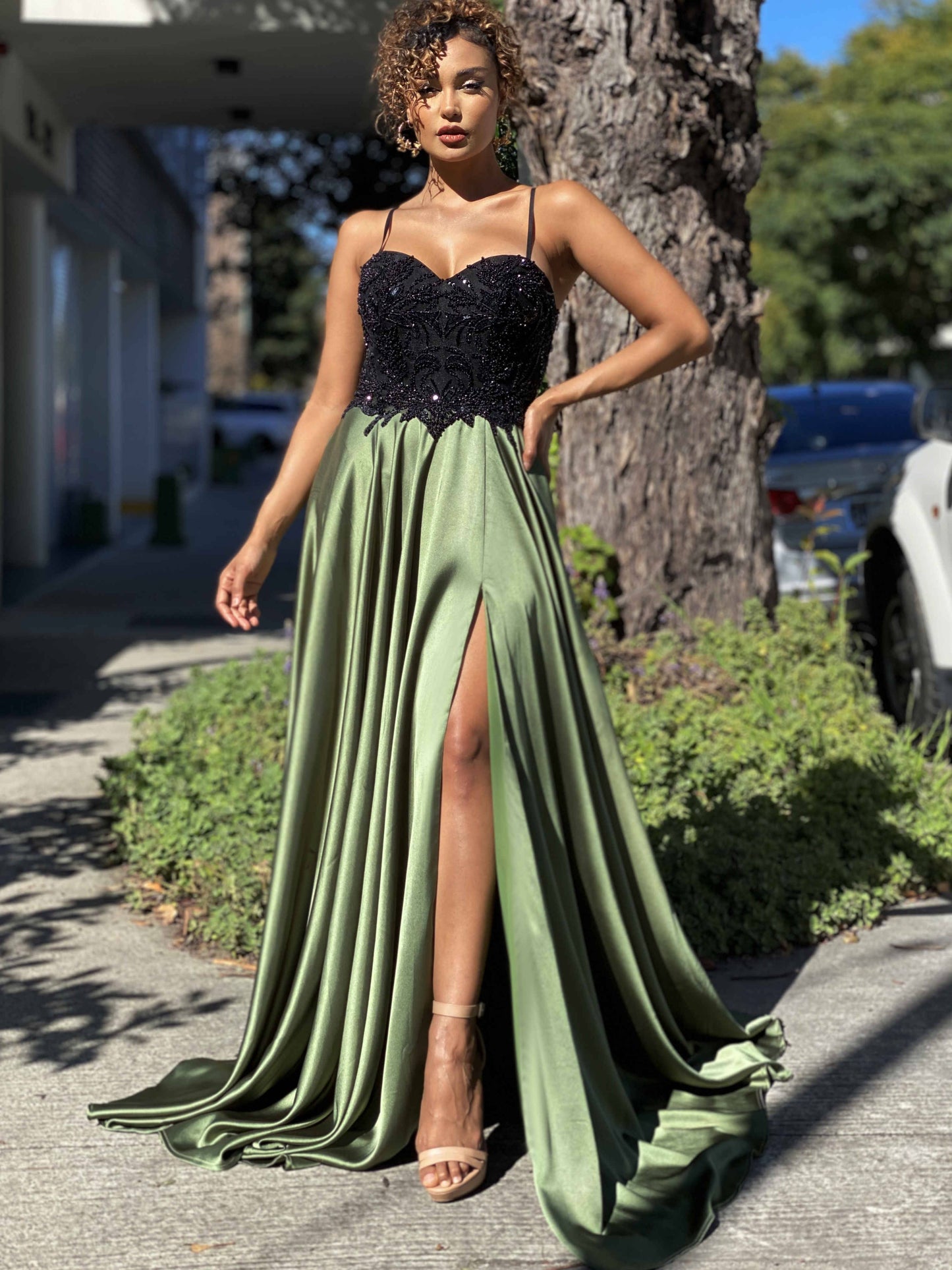 Jadore JX4075 black/green spaghetti strap with sweetheart neckline, padded bustier top with hand-beaded detailing and high split. Also available in: Black/Cobalt & Black/Red