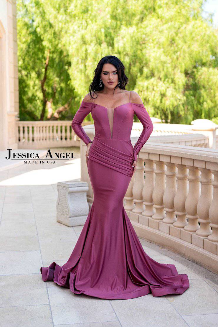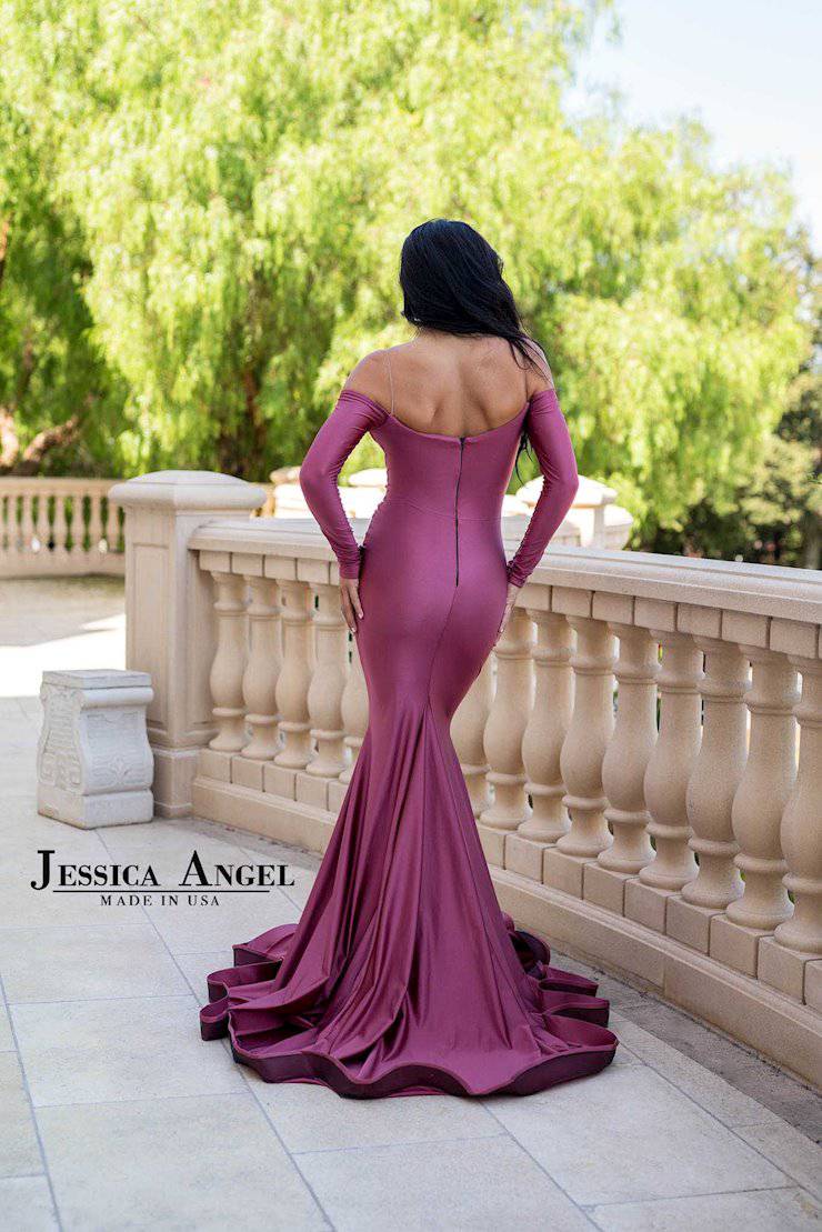 Jessica Angel 358 Off shoulder long sleeve with middle cut illusion and spaghetti strap, back zipper closure Trumpet gown.