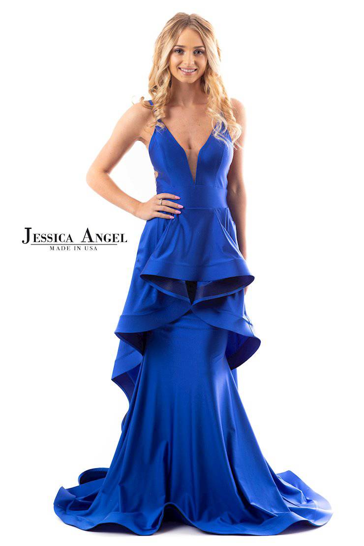 Jessica Angel 359 Plunging neckline V shape bare back with spaghetti strap Ruffled long dress.
