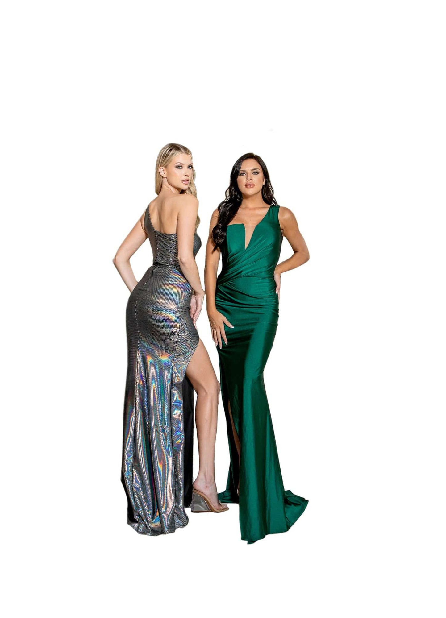 Jessica Angel 802 shimmering one shoulder long dress with high slit.