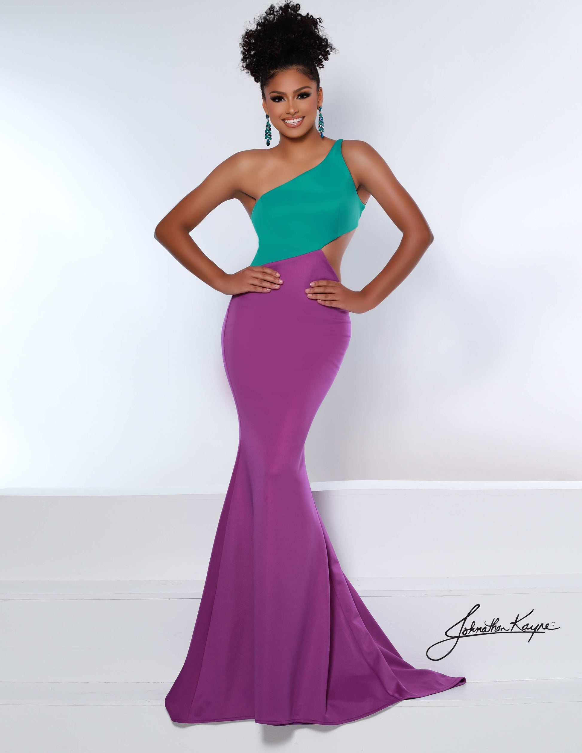 Johnathan Kayne 2402 Say goodbye to ordinary and step into this two-tone, one-shoulder gown. The asymmetrical cutout wraps around the body to flatter the waist and accentuate the open back. This style is ready to get laced up so you can get down on the dance floor.