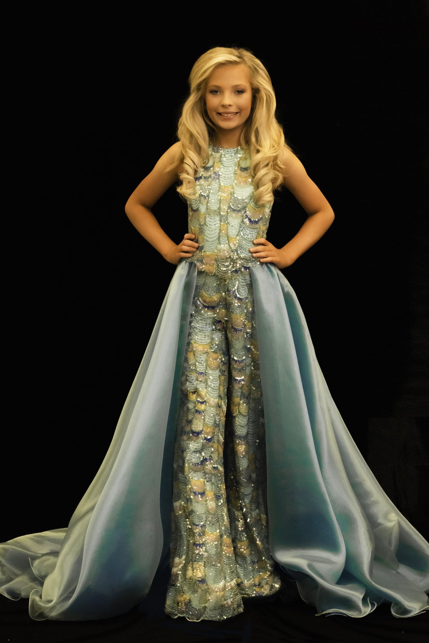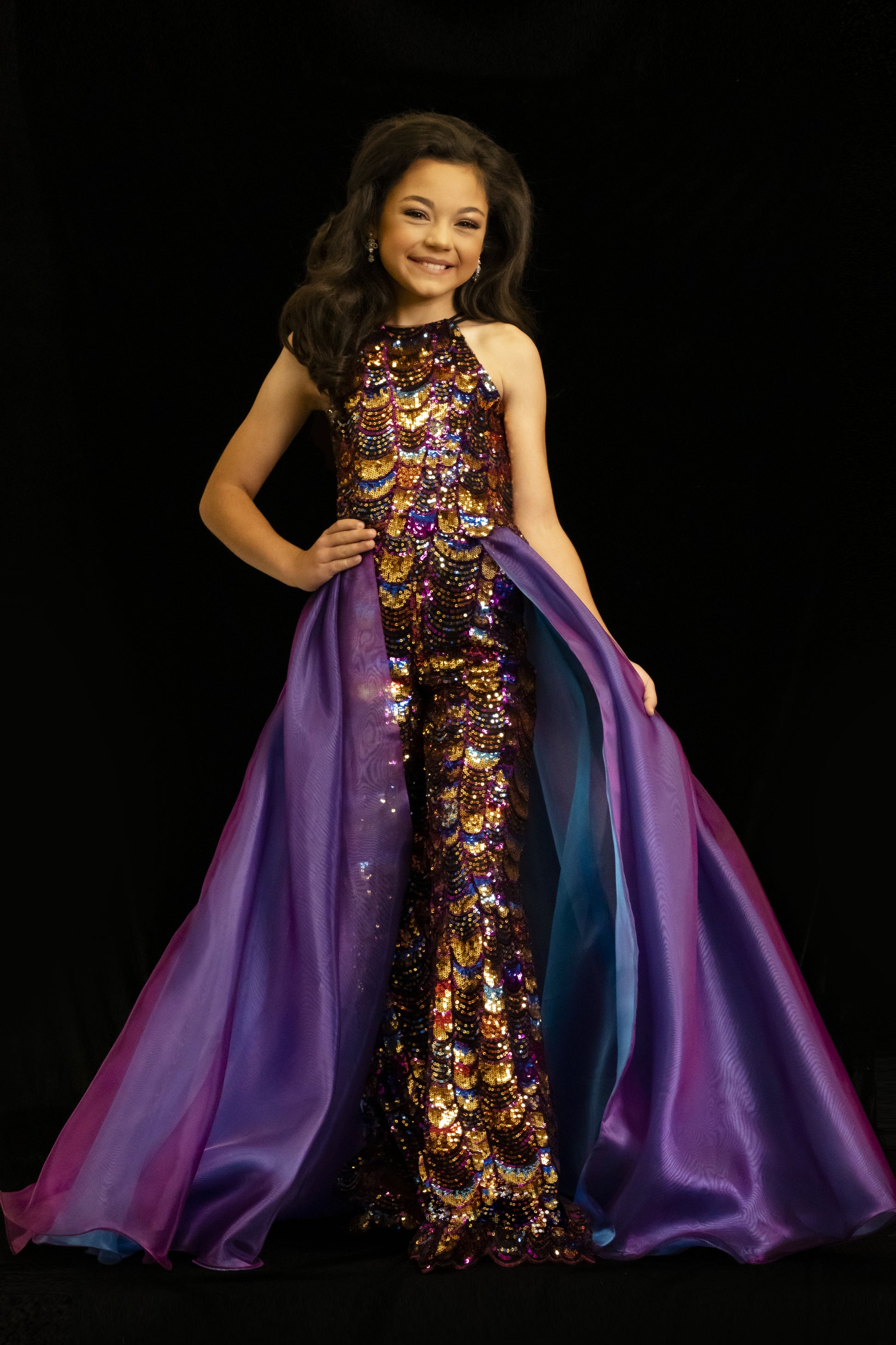 Johnathan Kayne C141 Bust a move and keep it fun in this multi-color sequin jumpsuit with two-tone organza overskirt. The halter neck is ultra cute and the shimmer of the fabric is perfect for all seasons.