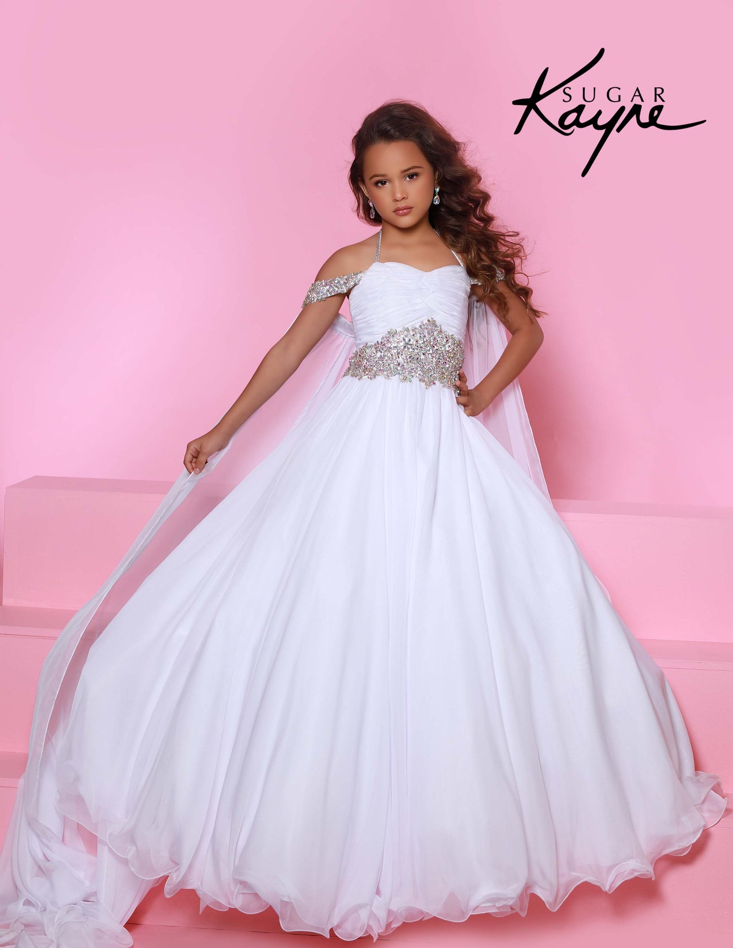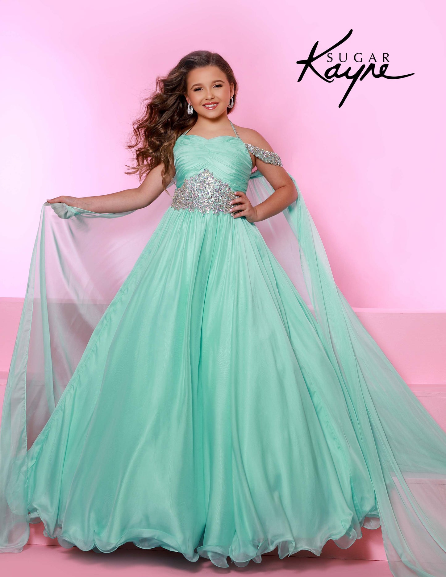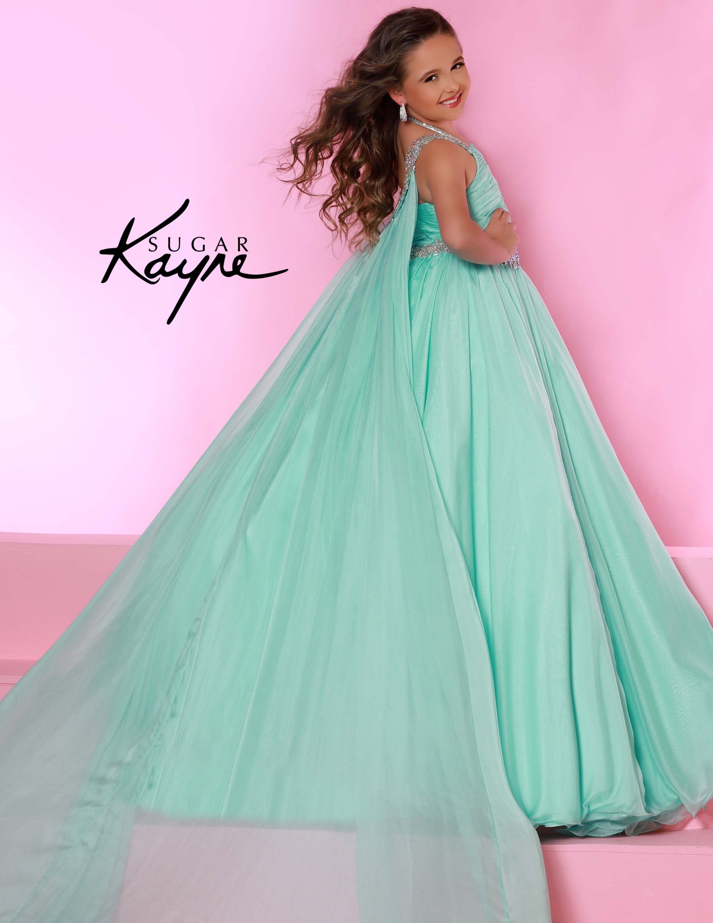 Johnathan Kayne C151 Steal the show in this pageant gown with the wide beaded belt and off the shoulder crystal cape. This poly chiffon ballgown is completed with AB beading and it is a sure winner.