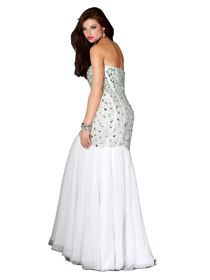 Sexy long beaded white mermaid prom gown features beautiful large mirrored beading and chiffon skirt. A beautiful long gown for a sweet sixteen.