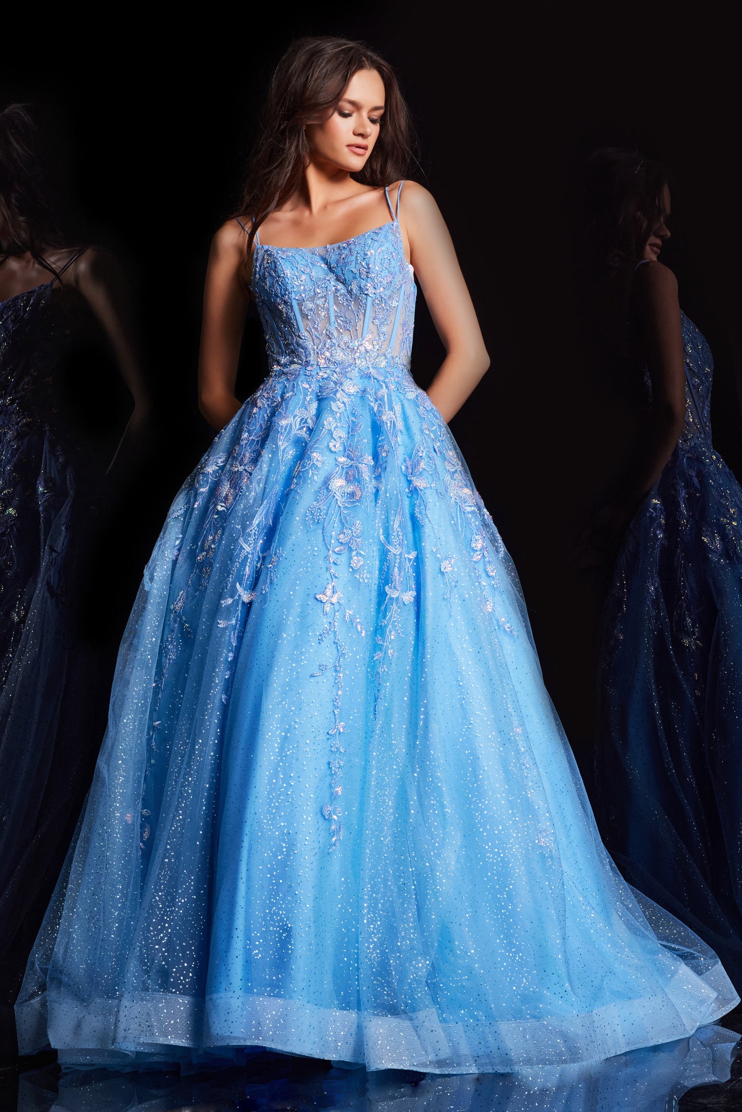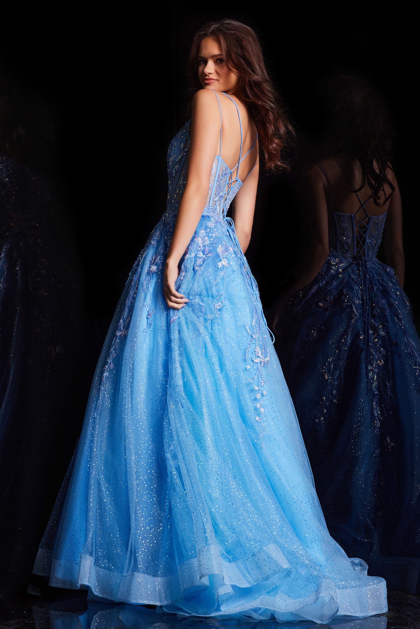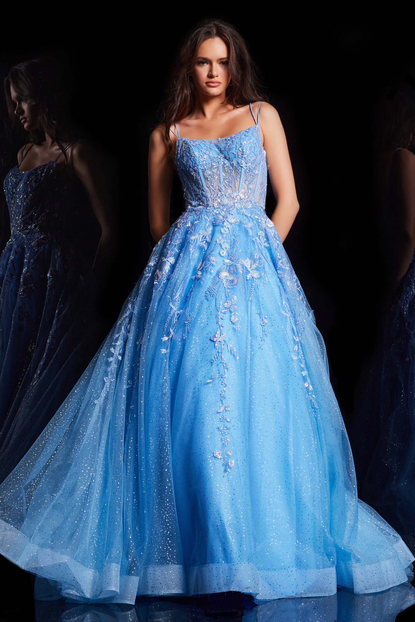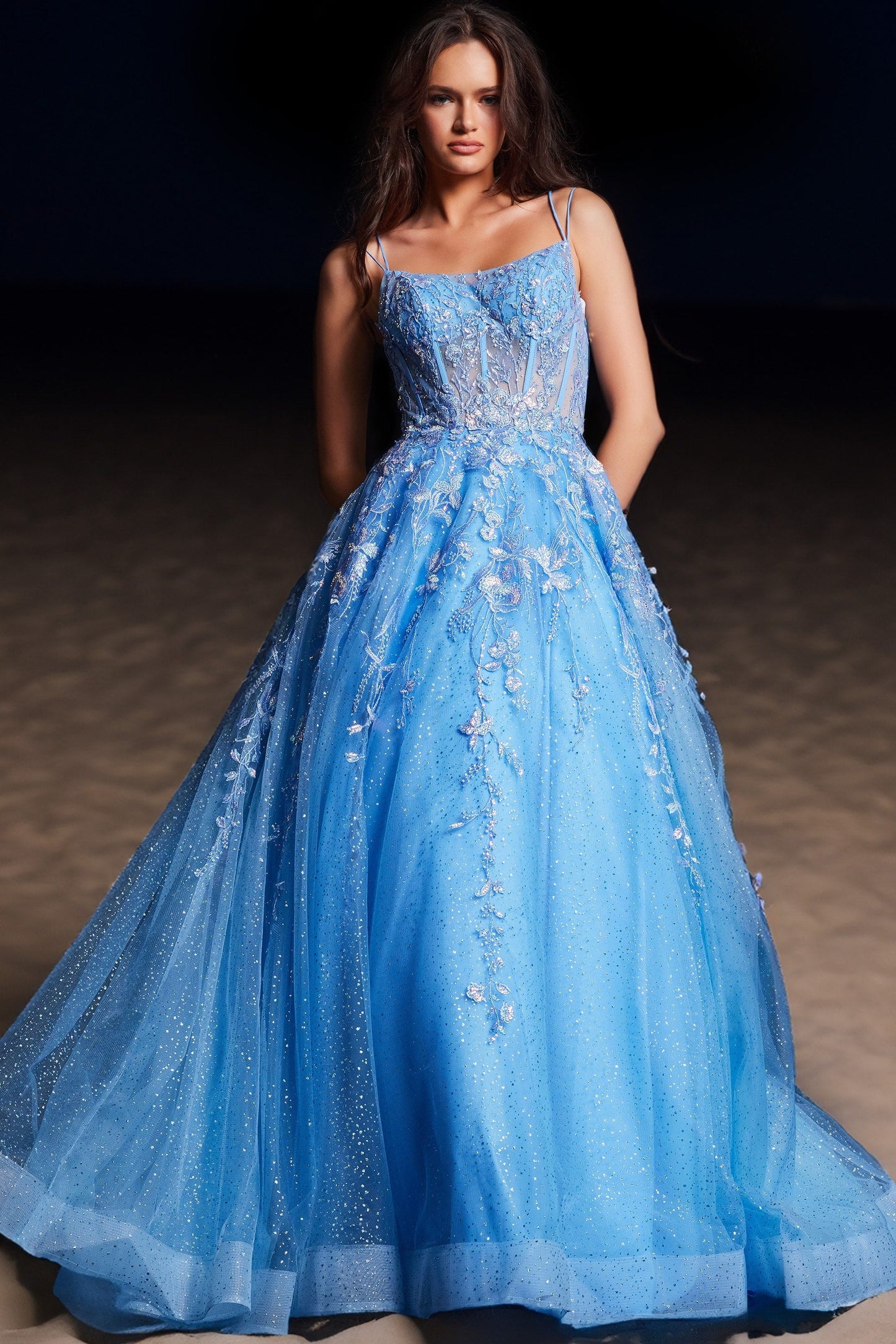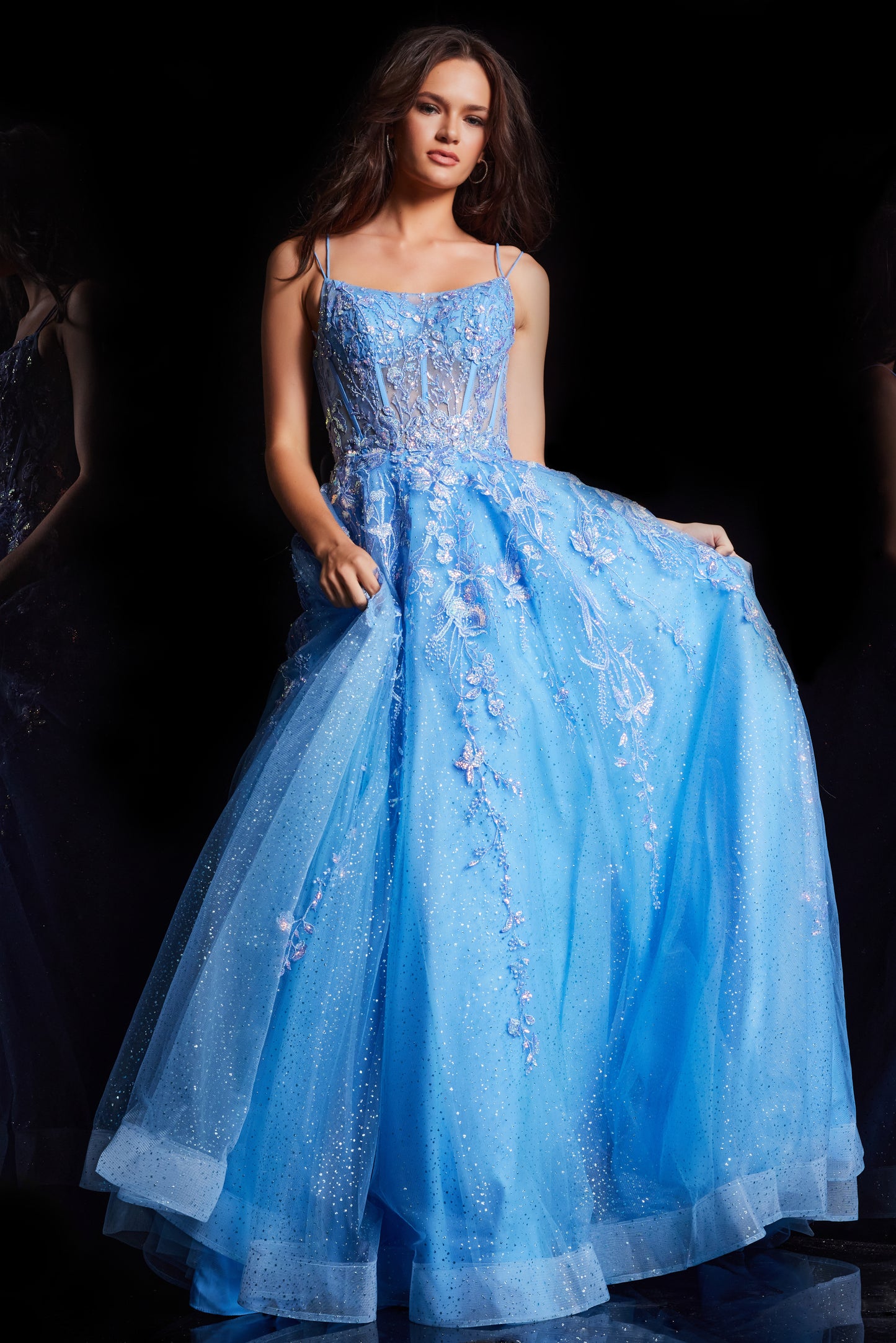 The Jovani 37421 glitter tulle prom ballgown has a strappy laced-up back, double spaghetti straps, and an illusion corset bodice with a semi-scoop neckline.