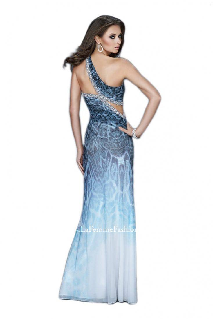 Go wild in this one shoulder animal print net gown with sexy front slit. The pleated bodice has an opening on one side that continues to the cut out back which is lined with stones and sequins for an extra dazzling affect. Side zipper closure.