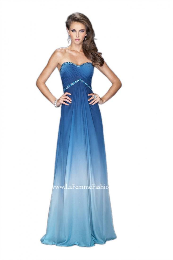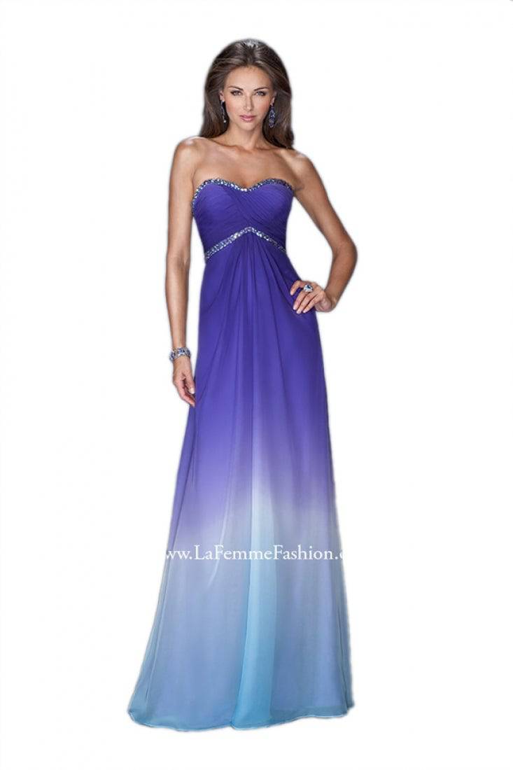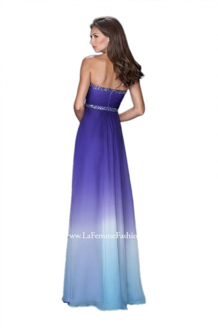 "Beautiful ombre dyed chiffon dress with a modified sweetheart neckline. Criss cross pleating and iridescent beading embellish the bodice and back. Back zipper closure. "