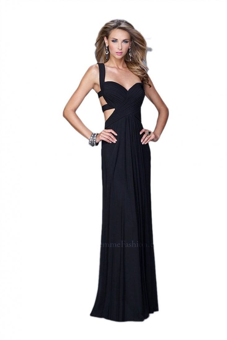 Elegant net jersey dress with a gathered bodice and cutout straps that connect in back. Back zipper closure.