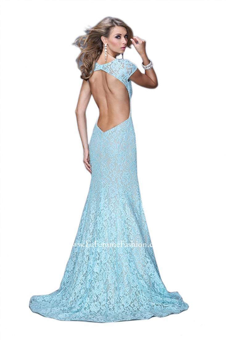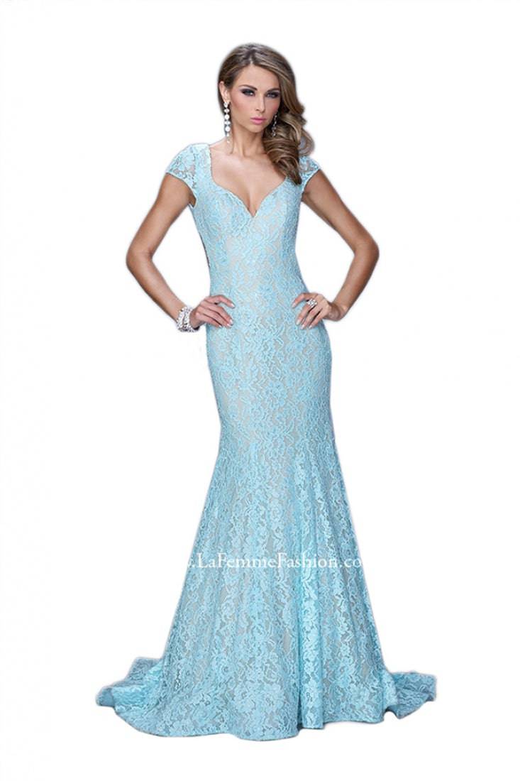 Sophisticated cap sleeve lace mermaid gown with nude lining and sweetheart neckline. Back is open with the sleeves hooking across at the neck. Back zipper closure.