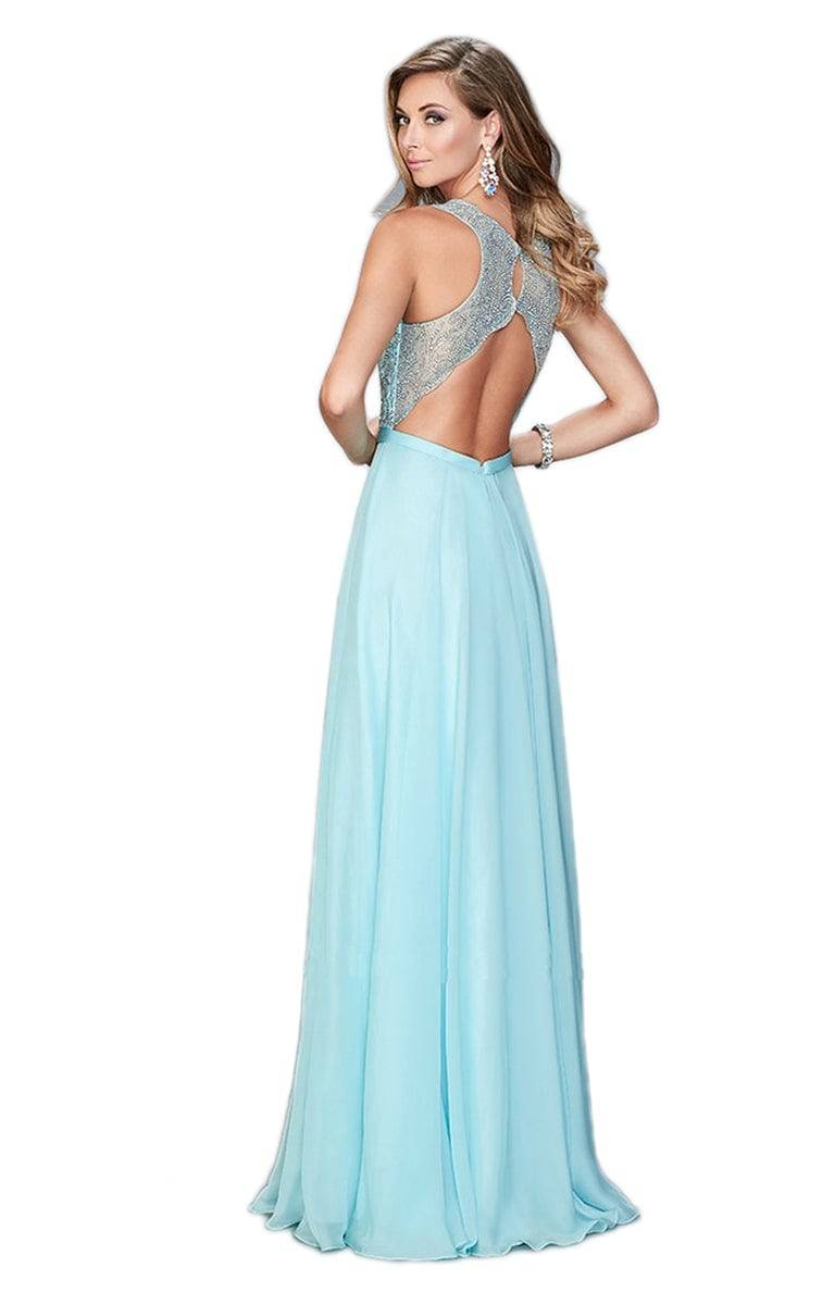 Graceful chiffon gown with scalloped neckline and open back. The bodice is embellished with a stunning swirl rhinestone design. Back zipper closure.