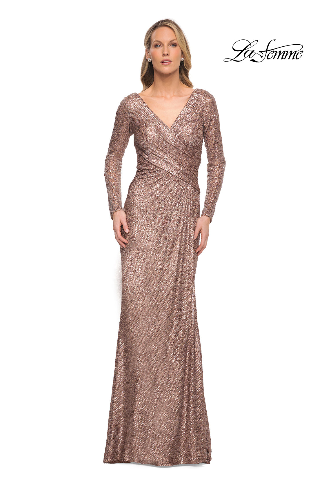 La Femme 30310 Matte metallic long evening dress with long sleeves. The dress features ruching across the waist and a V neckline. Back zipper closure.