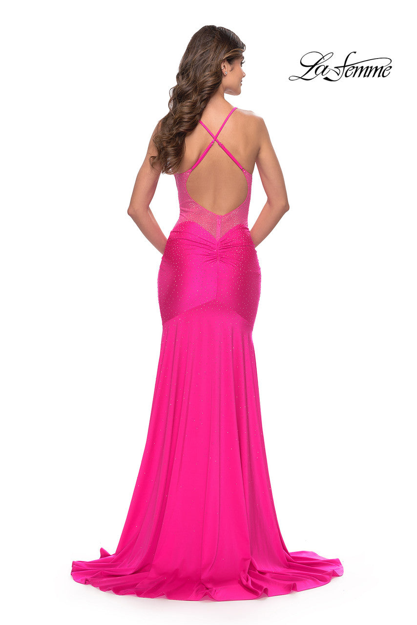 La Femme 31403 Dramatic rhinestone jersey gown with train and sheer detail around the back and sides. V neckline and open back. Back zipper closure.