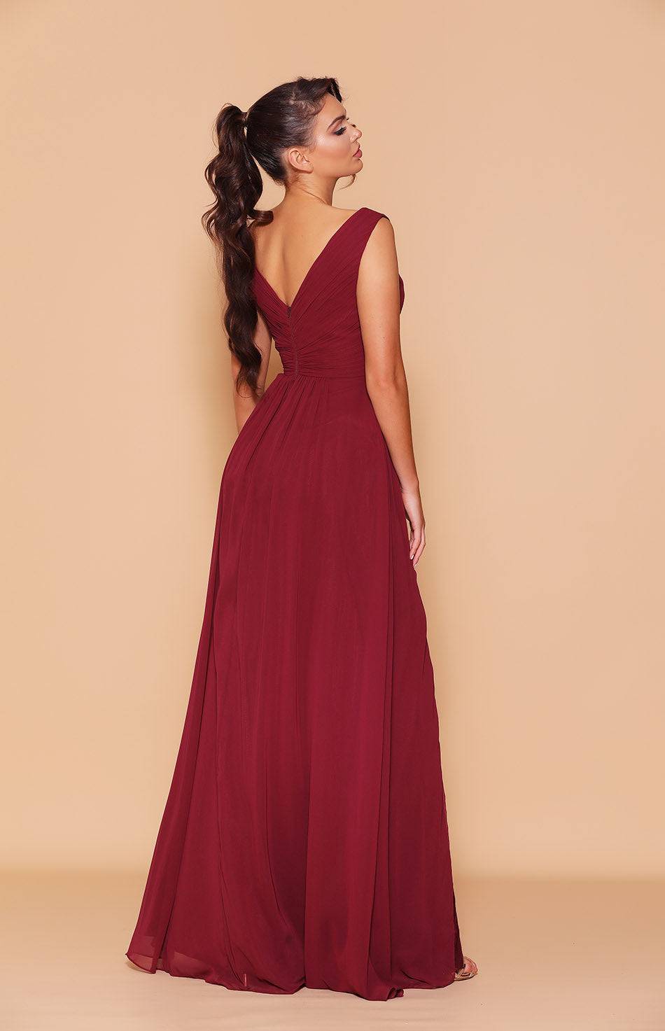 Les Demoiselle LD1070 wine sleeveless v-neckline bodice features cinched in waist and side split.