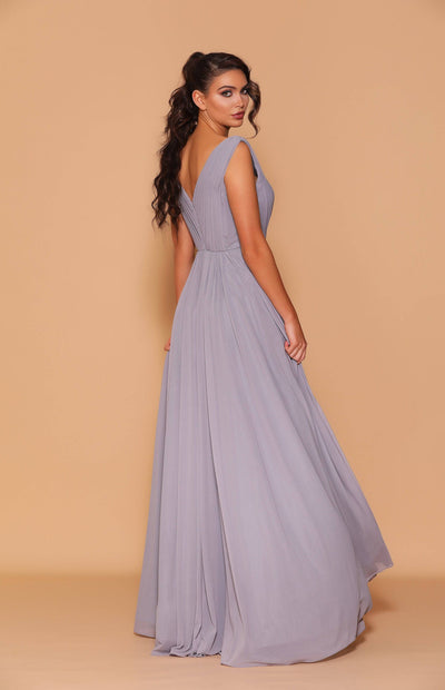 Les Demoiselle LD1109 ice smoke v-neckline and v-back with a beautiful cross over, pleated detailing on the bodice. The dress is cinched at the waistline before flaring out into a stunning flowing skirt to create the elegant A-Line silhouette.