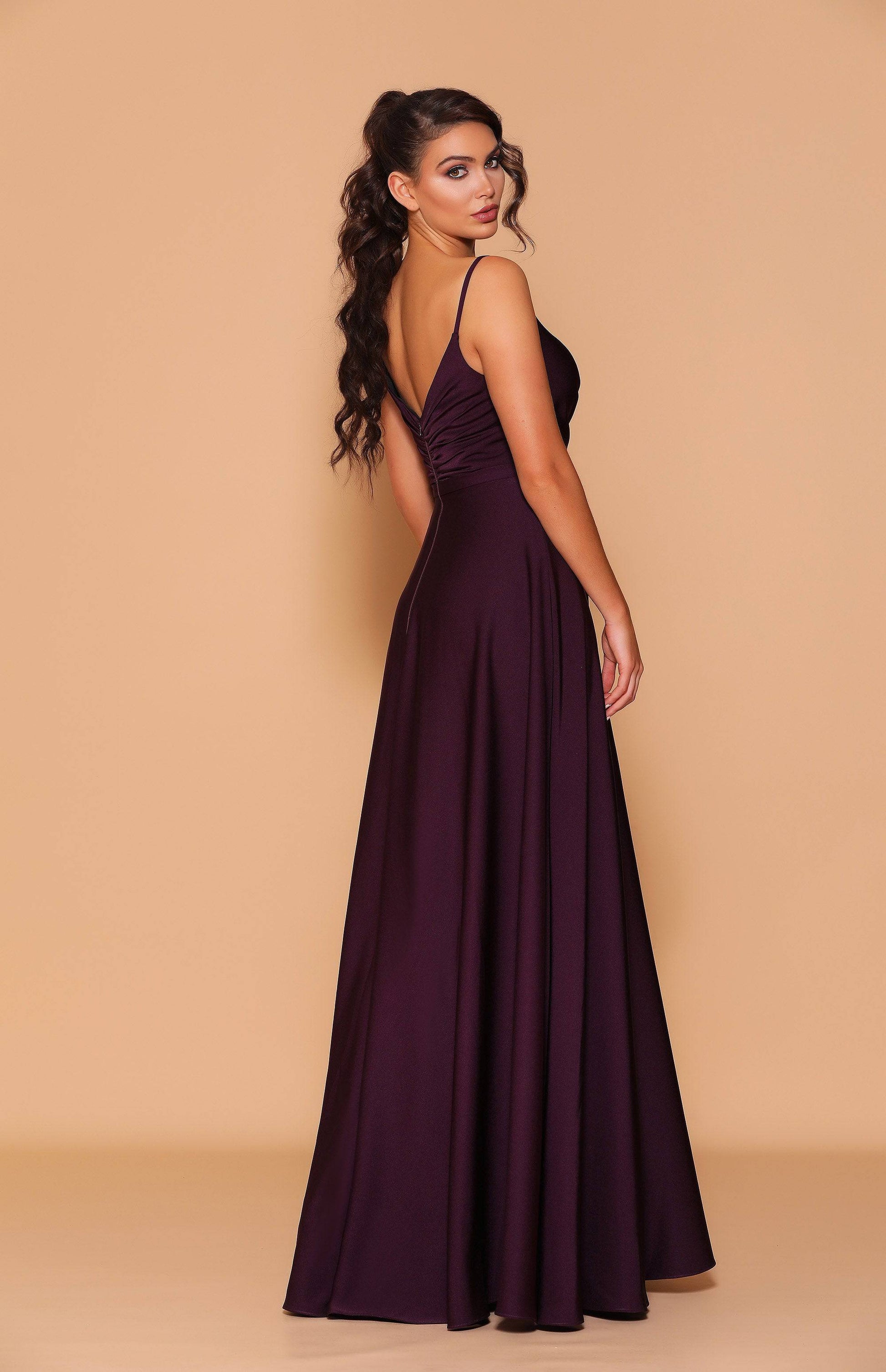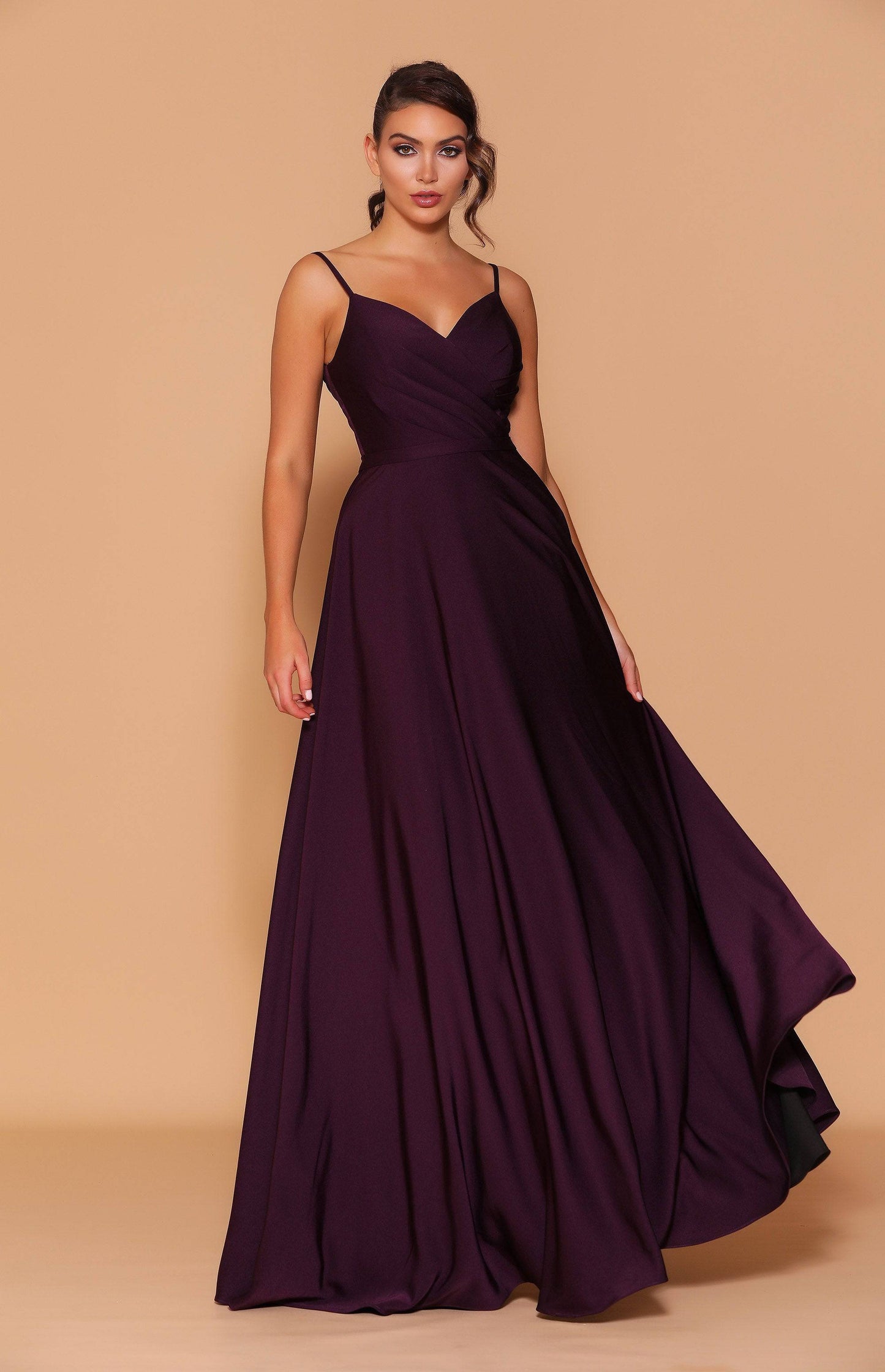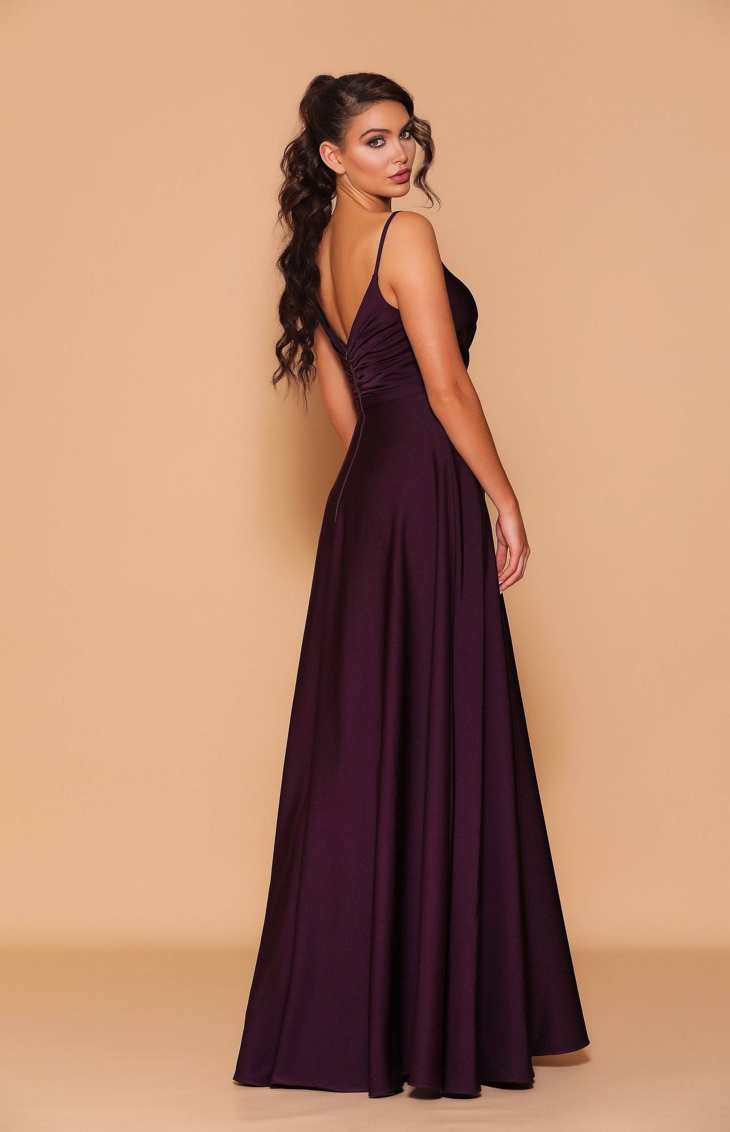 Les Demoiselle LD1128 plum spaghetti straps, ruched front and back bodice, cinched waist and flowing skirt long dress.