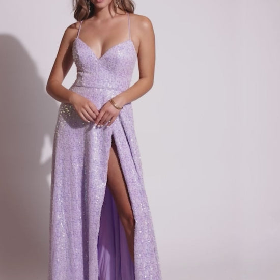 Lucci Lu 1253 V-Neck Neckline Criss Cross Back High Slit Sequins A-Line Evening Dress