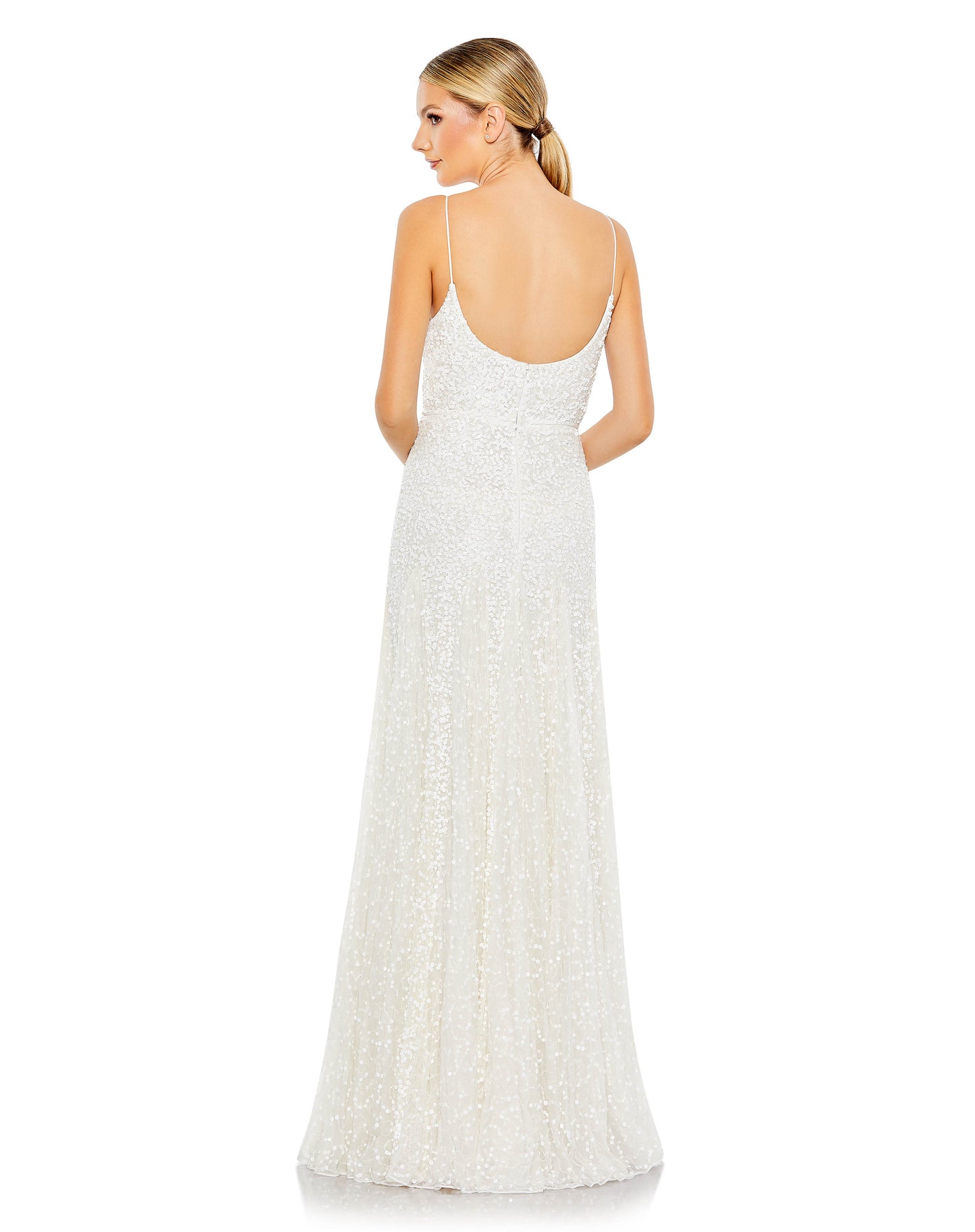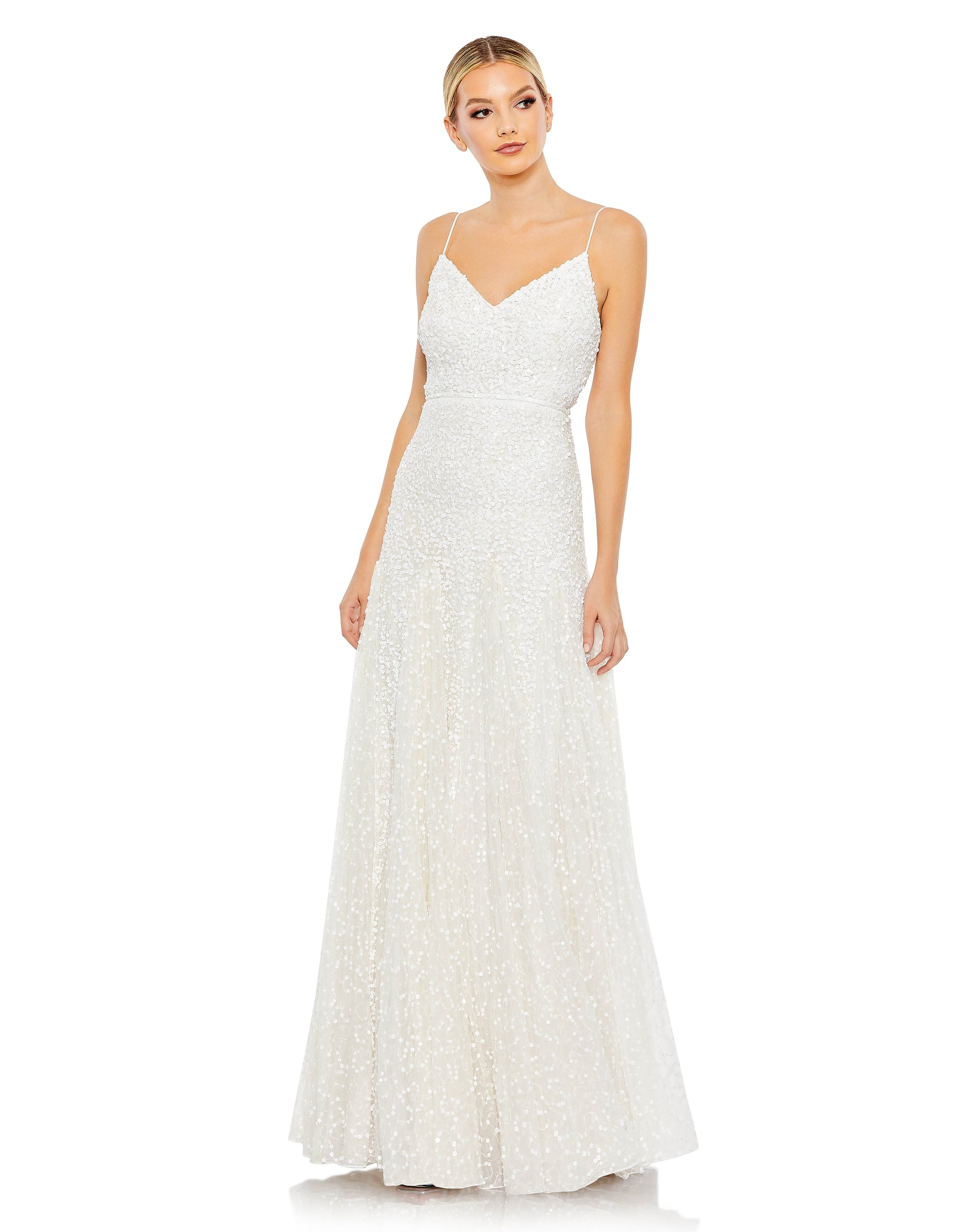 Mac Duggal 10882 This gown is fashioned in allover sequins, with spaghetti straps edging the shallow V-neckline and scoop back. This fit and flare evening dress finishes in a godet skirt and a slight brush train.