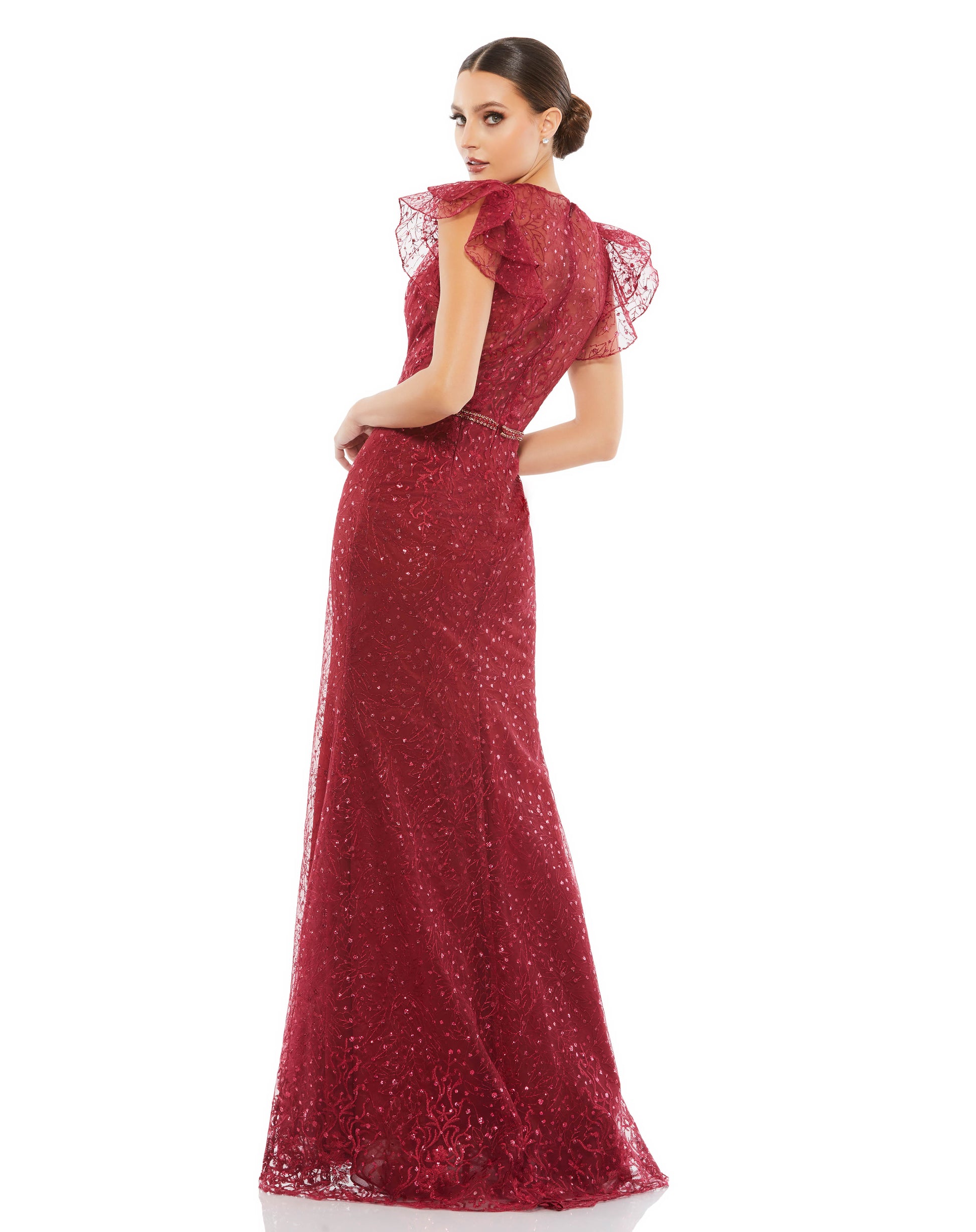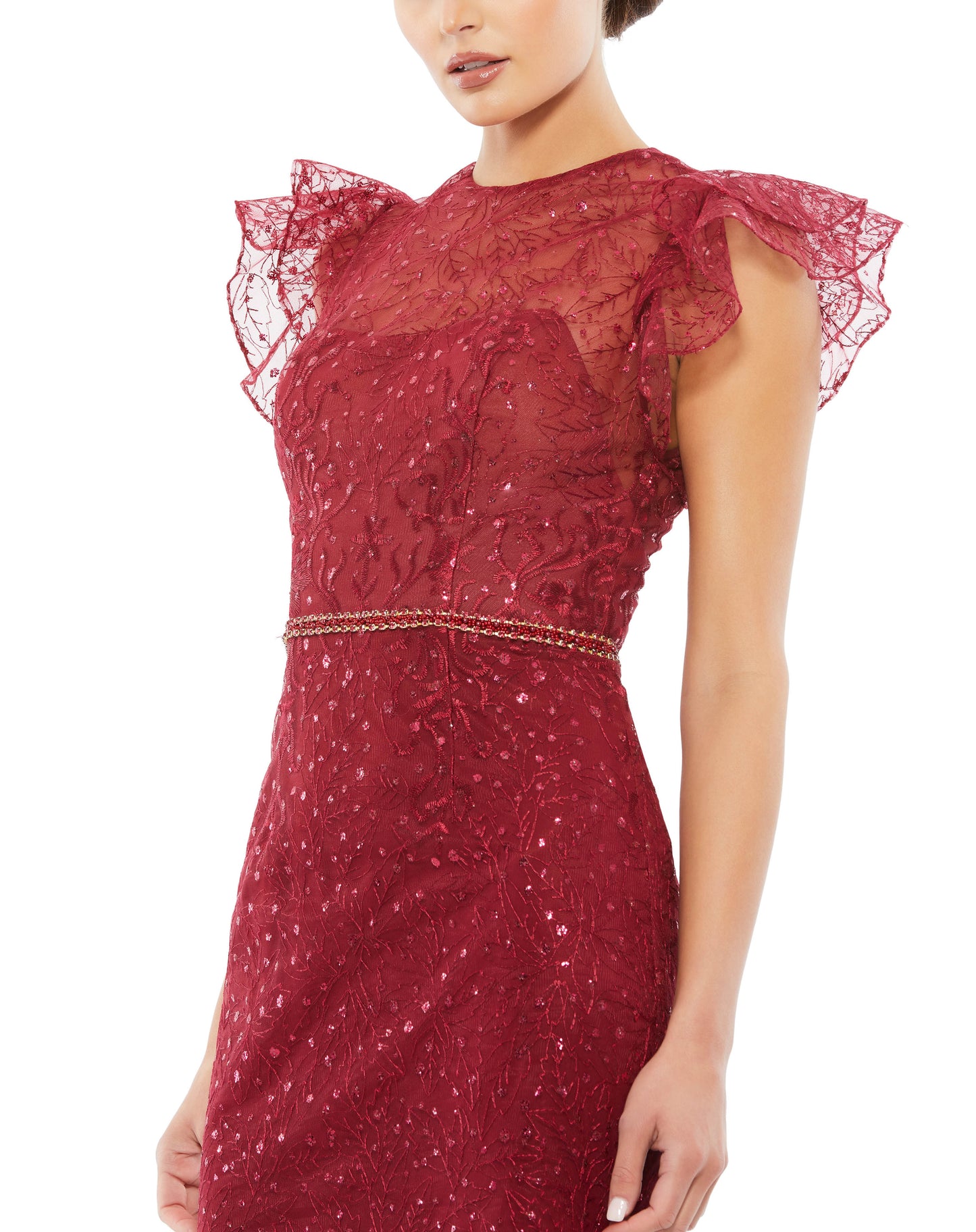 Mac Duggal 12465 The creative design is fashioned from sheer, structured organza detailed with branch embroidery and dots of glitter. Lined from the chest down, the dress is styled with a jewel-neckline illusion bodice and flirty ruffled sleeves. Crystals encircling the waist deliver stunning punctuation.