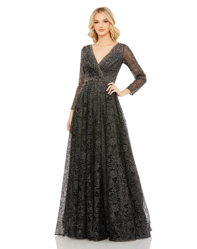 Mac Duggal 20372 This gorgeous A-Line evening gown features opulent lace and sparkling beading to create a striking item appropriate for any special occasion. This dress offers classic elegance with a contemporary edge thanks to its long sleeves and extended silhouette, which is highlighted by a high V-neckline. This dress has a distinctive, statement-making design thanks to the elaborate detailing and zipper closure in the back, making it the perfect evening gown for the mother of the bride or a plus-size woman seeking something truly unique. This lovely long dress is the ideal option if you want to make a statement at a wedding or a charity event.