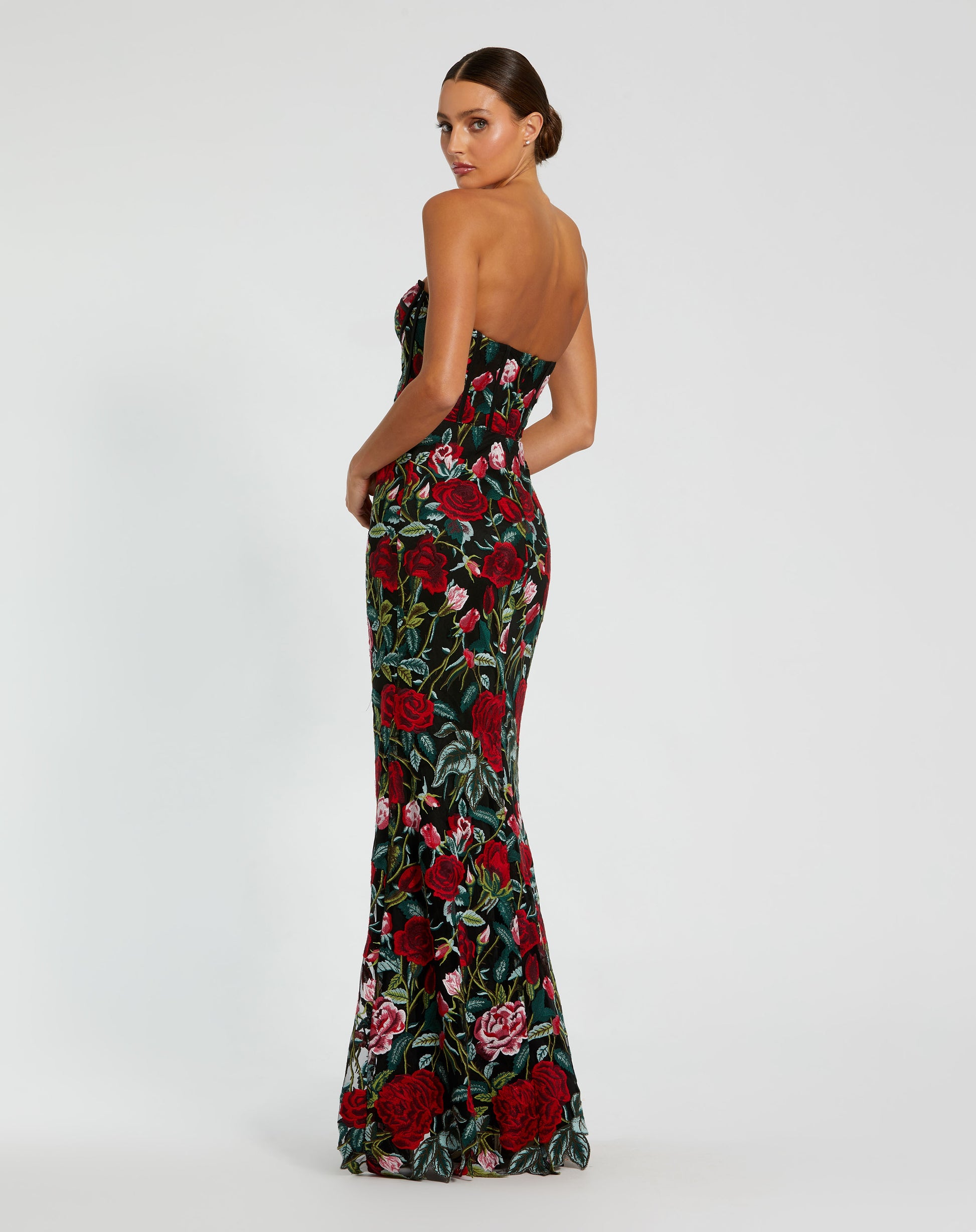 This stunning gown boasts a strapless sweetheart neckline and a supportive bustier, creating a flattering and elegant silhouette. The intricate floral applique and embroidery add a touch of sophistication to this formal piece. Perfect for any event, feel confident and beautiful in this Mac Duggal creation.