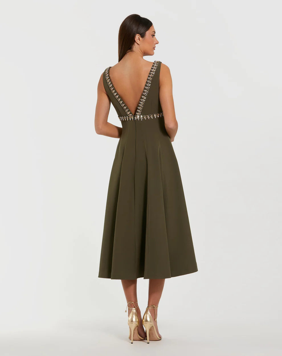 Elevate your evening with the Mac Duggal 21159, a green crepe A-line midi dress exquisitely adorned with rhinestone embellishments. Its flattering silhouette enhances your figure, while the delicate sparkle adds refined glamour suitable for formal occasions. Crafted for both comfort and style, this dress combines timeless elegance with expert design, making it a standout choice for your next special event.