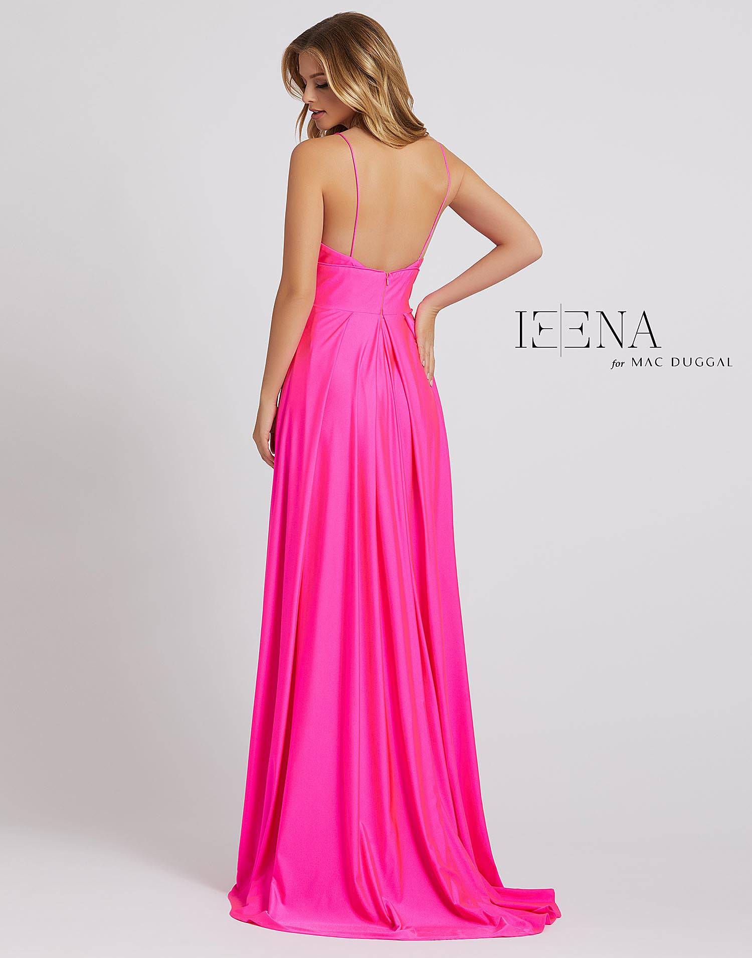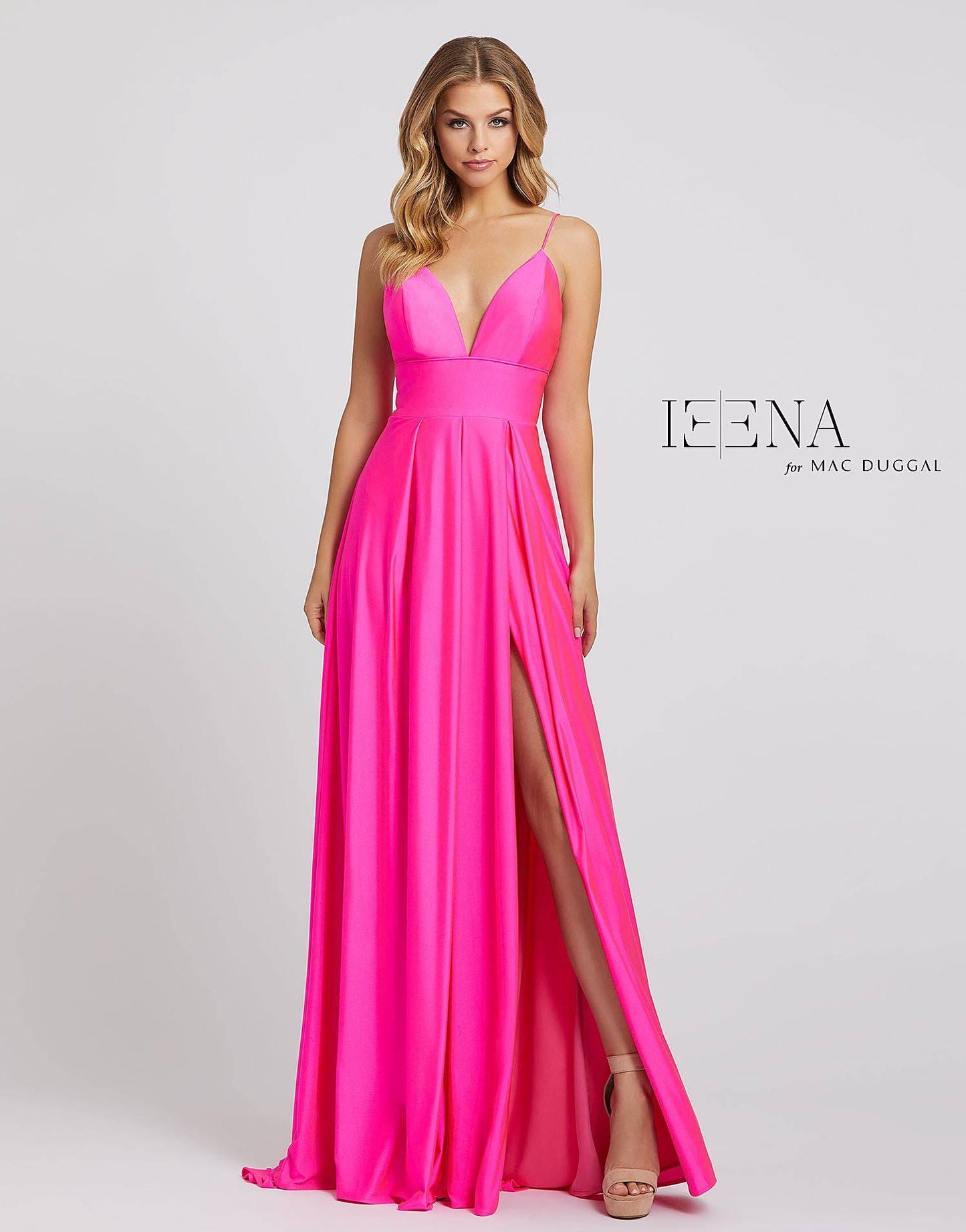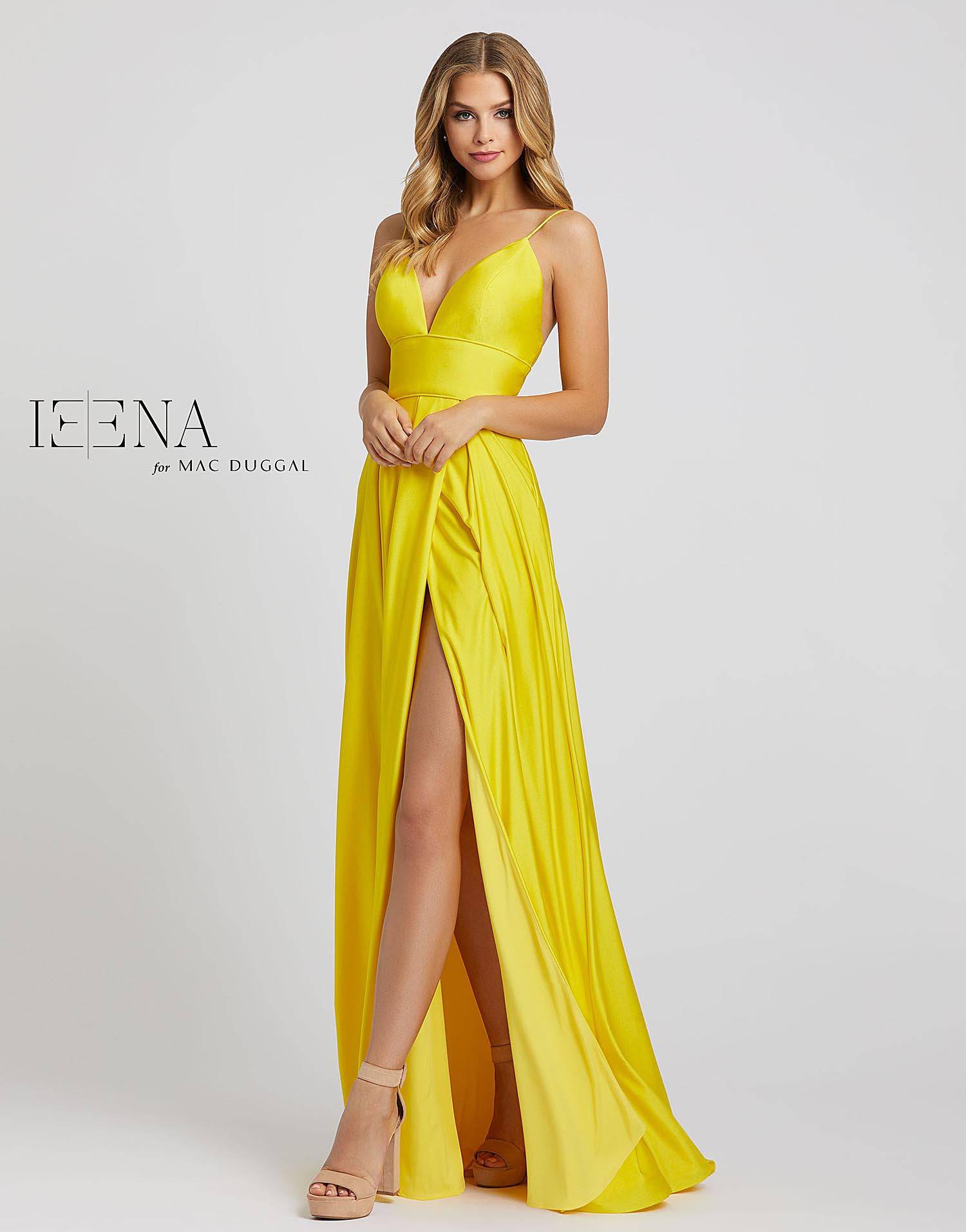 This sheath gown features a sweetheart neckline, spaghetti strap, an open back, and a thigh high slit. Available in Electric Pink, Sunshine Yellow and Black