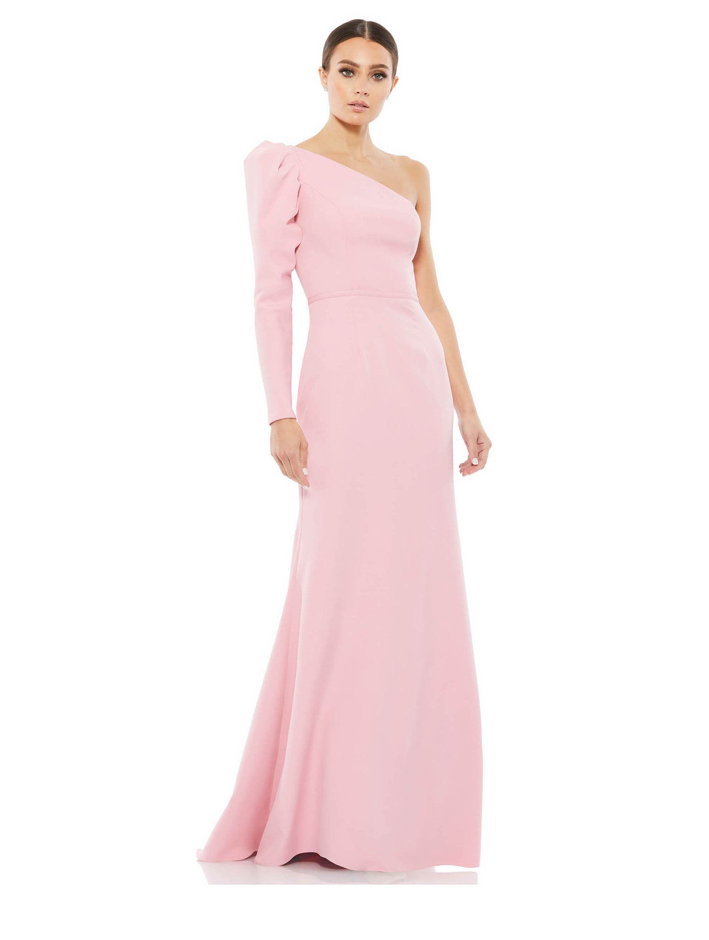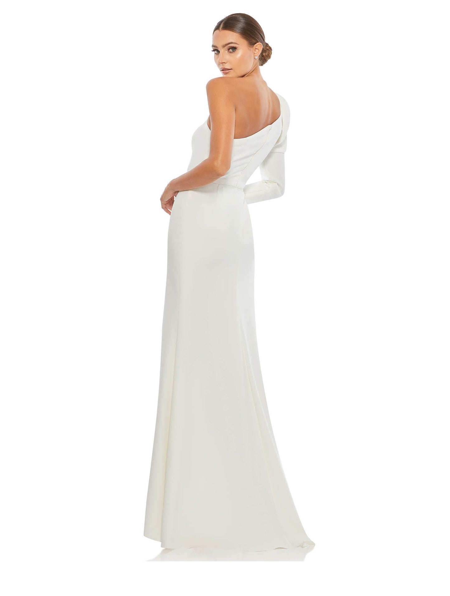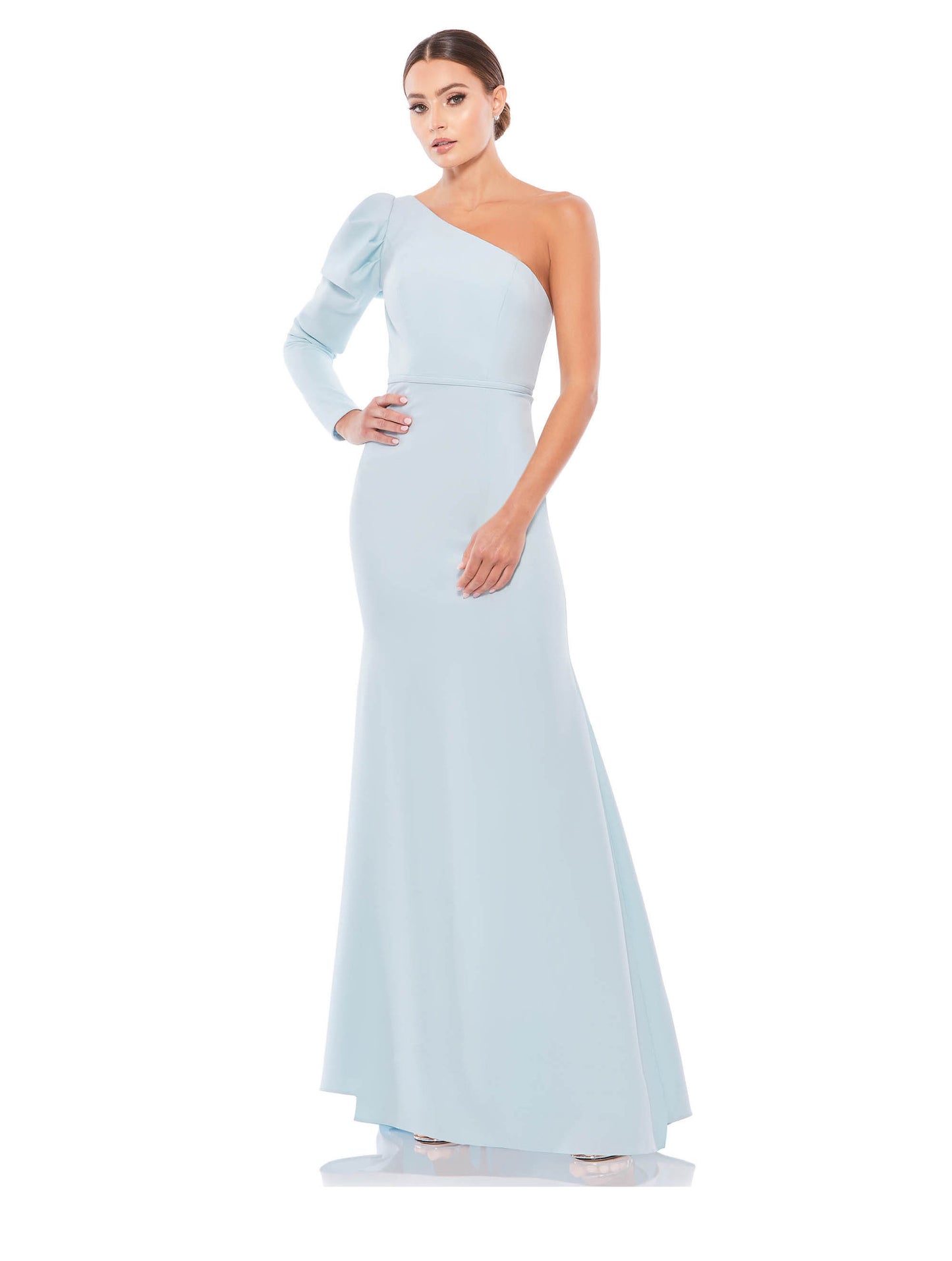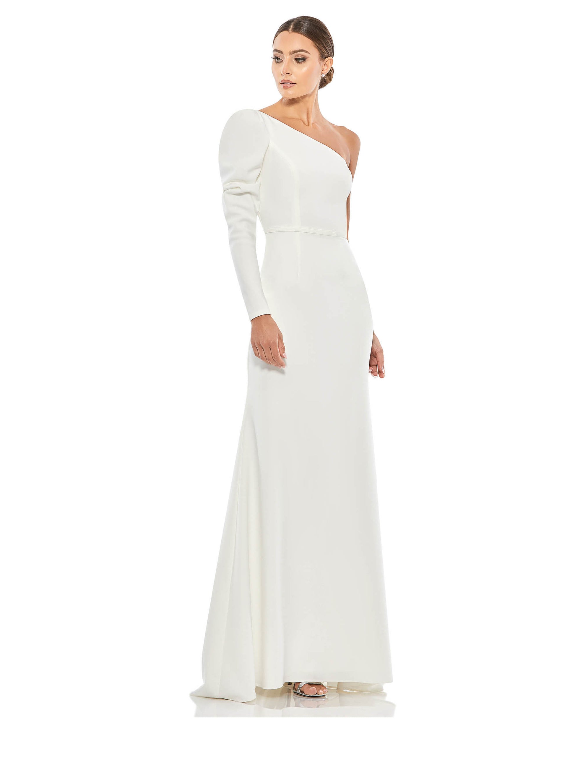 Mac Duggal 26592 white One shoulder trumpet gown with a single puffed long sleeve. Also available in: Powder Blue & Rose Pink