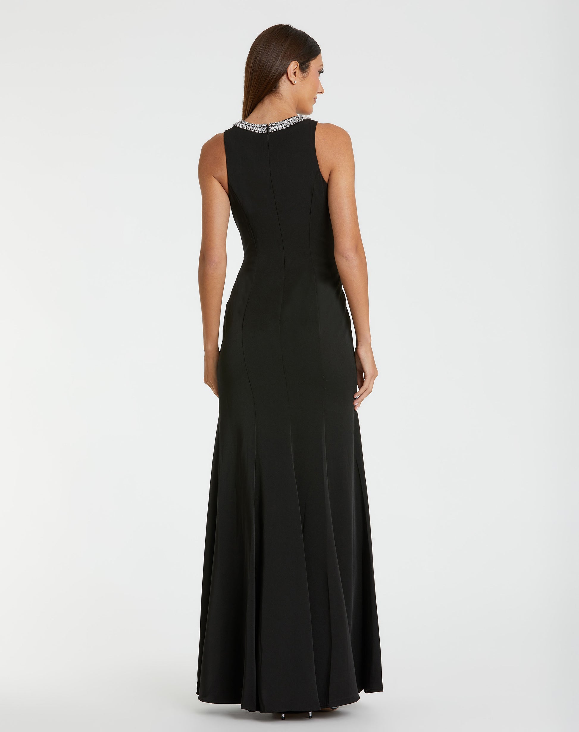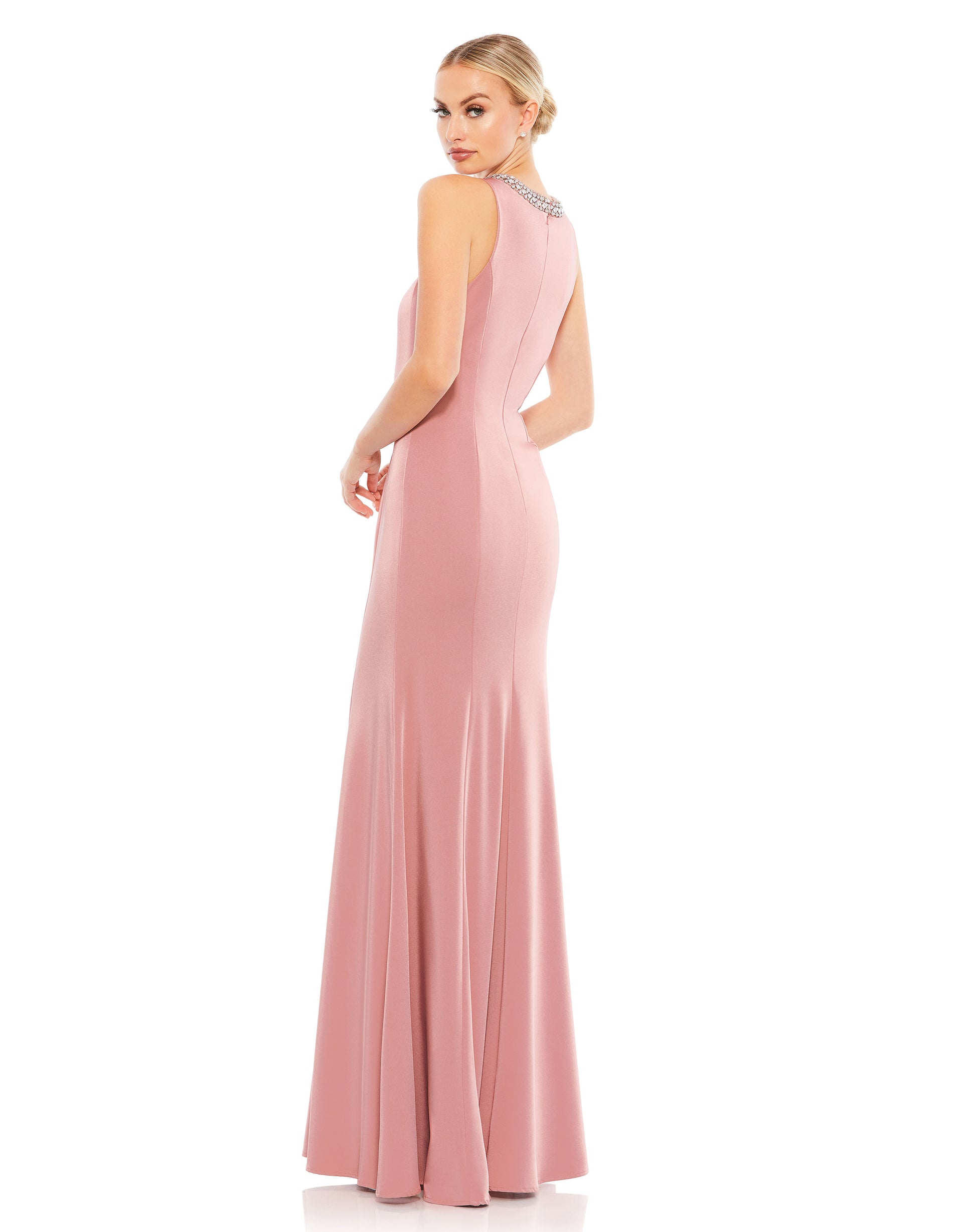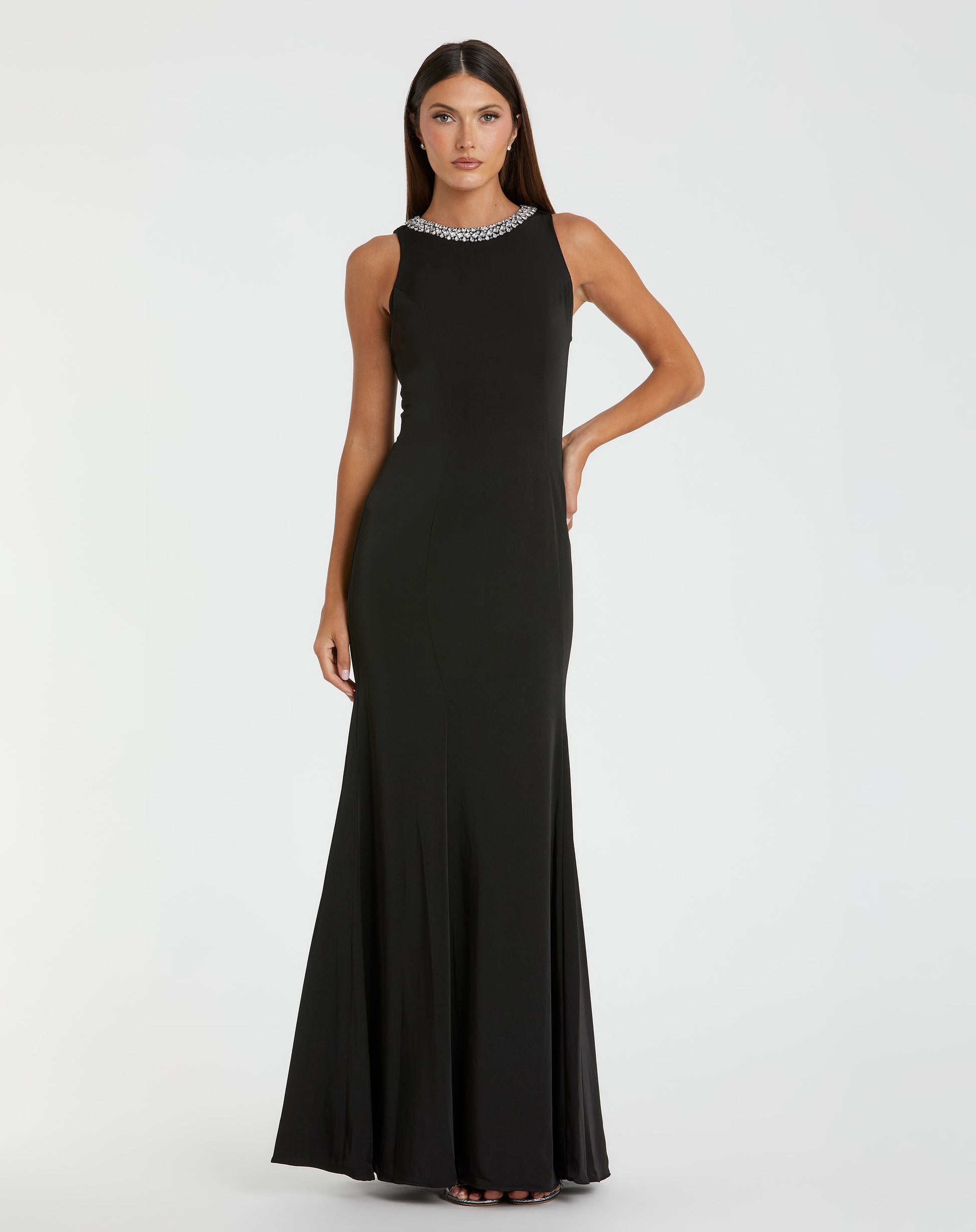 This elegant Mac Duggal 49093 satin gown boasts a stunning flared trumpet skirt and a bodice and waist that hugs your figure for a classic and flattering silhouette. The rhinestone-encrusted neckline adds a touch of sparkle to this dreamy, floor-length gown.