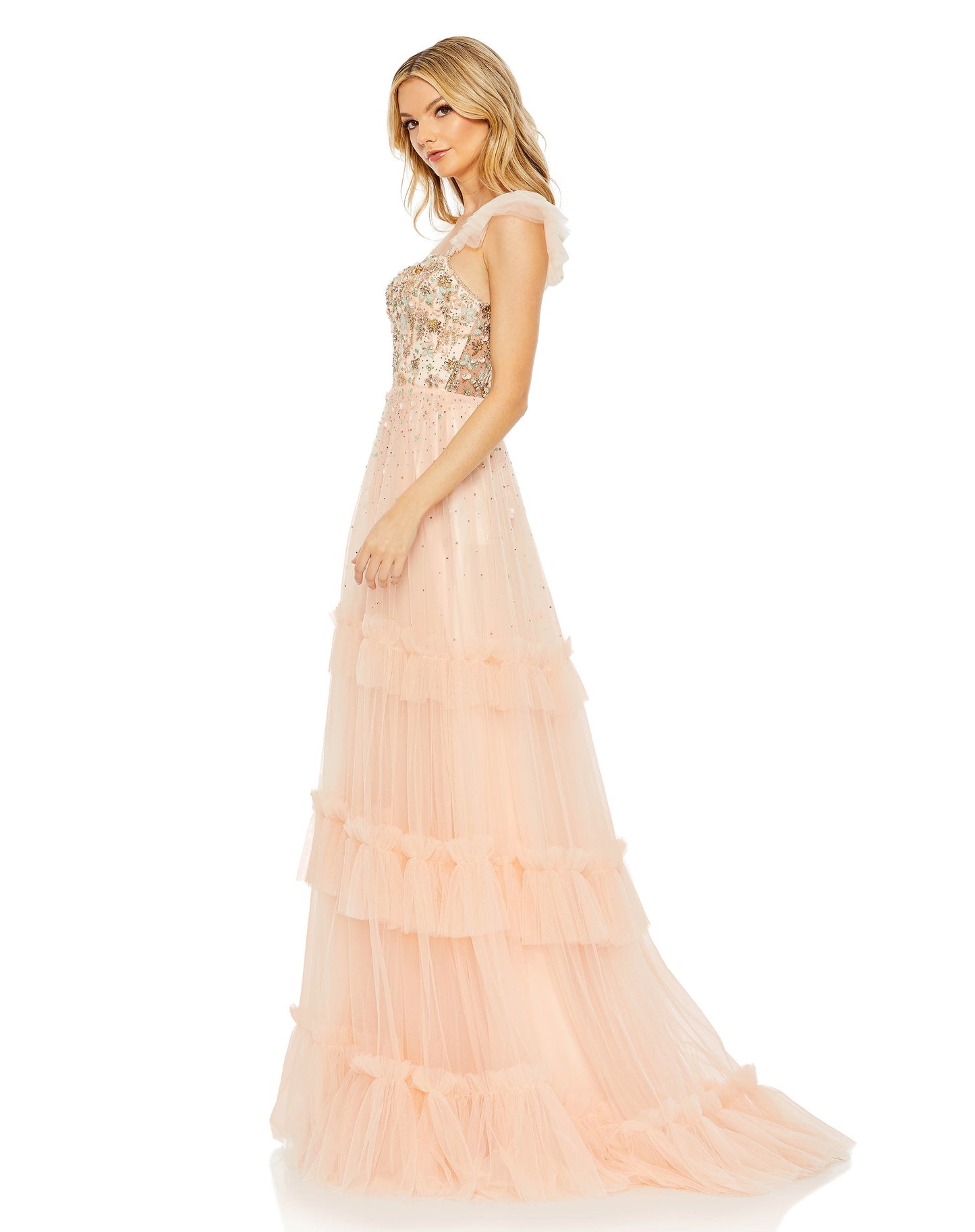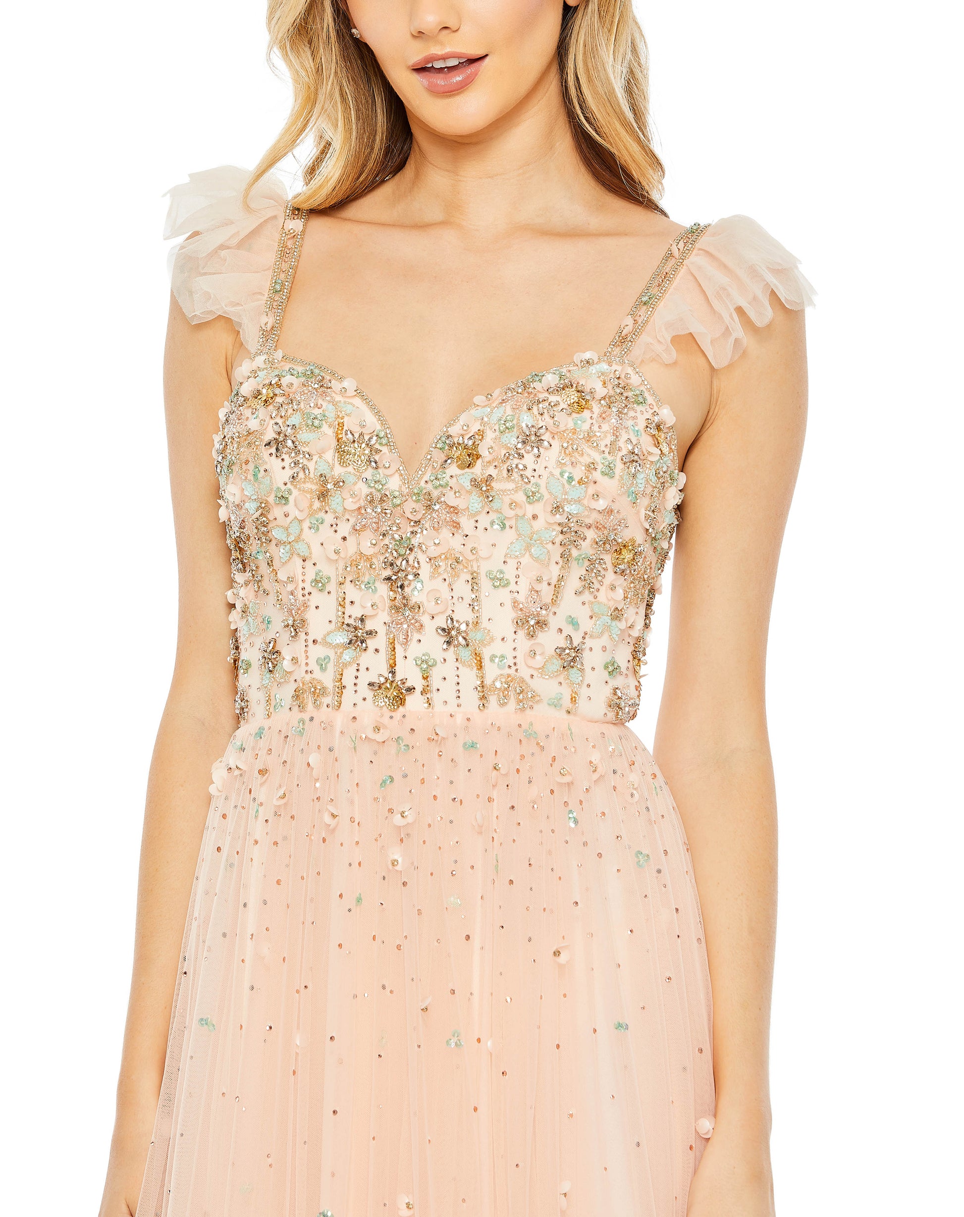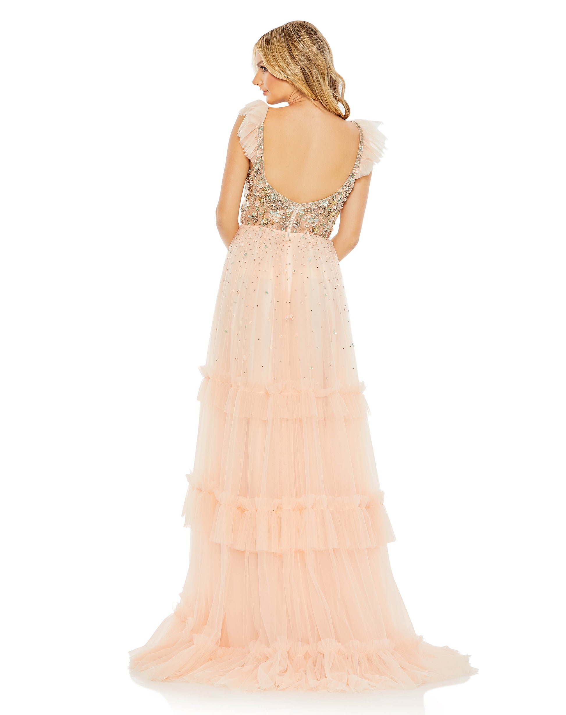 Mac Duggal 50648 One of our favorite designs this season, this breathtaking dress has us completely smitten. An ornate twist on boho styling, the luxurious gown is designed with a fitted jeweled bodice that spills onto a dreamy skirt of weightless tulle. Beaded straps alongside fluttery cap sleeves and a low, sheer back are details you’ll swoon for.