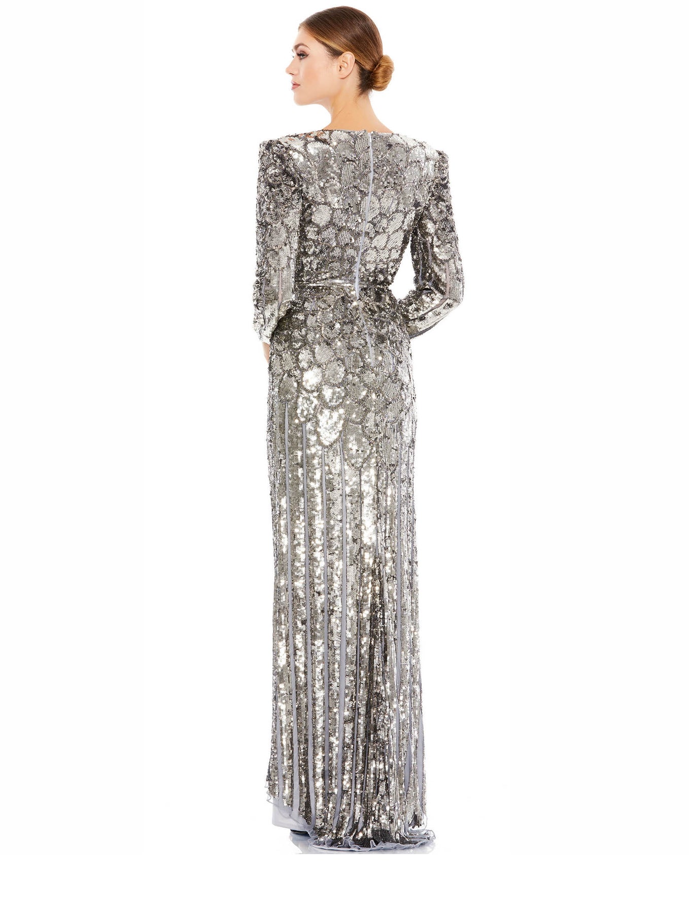 Mac Duggal 5382 shimmering and embellished pewter long sleeves long dress with v-neckline and high slit. Also available in: Gold