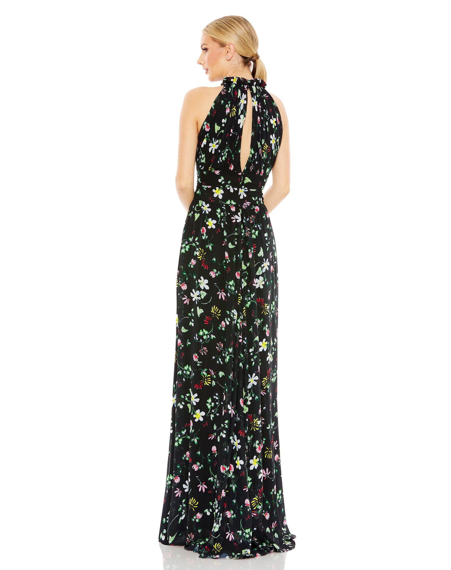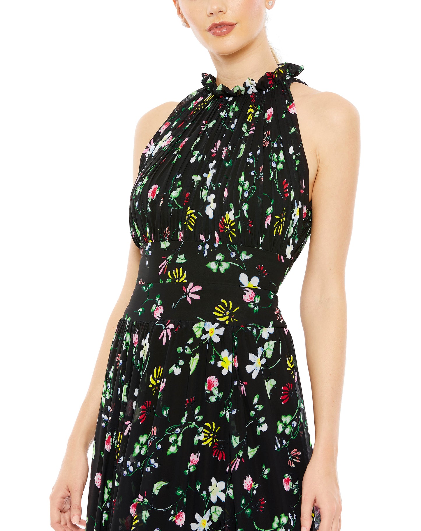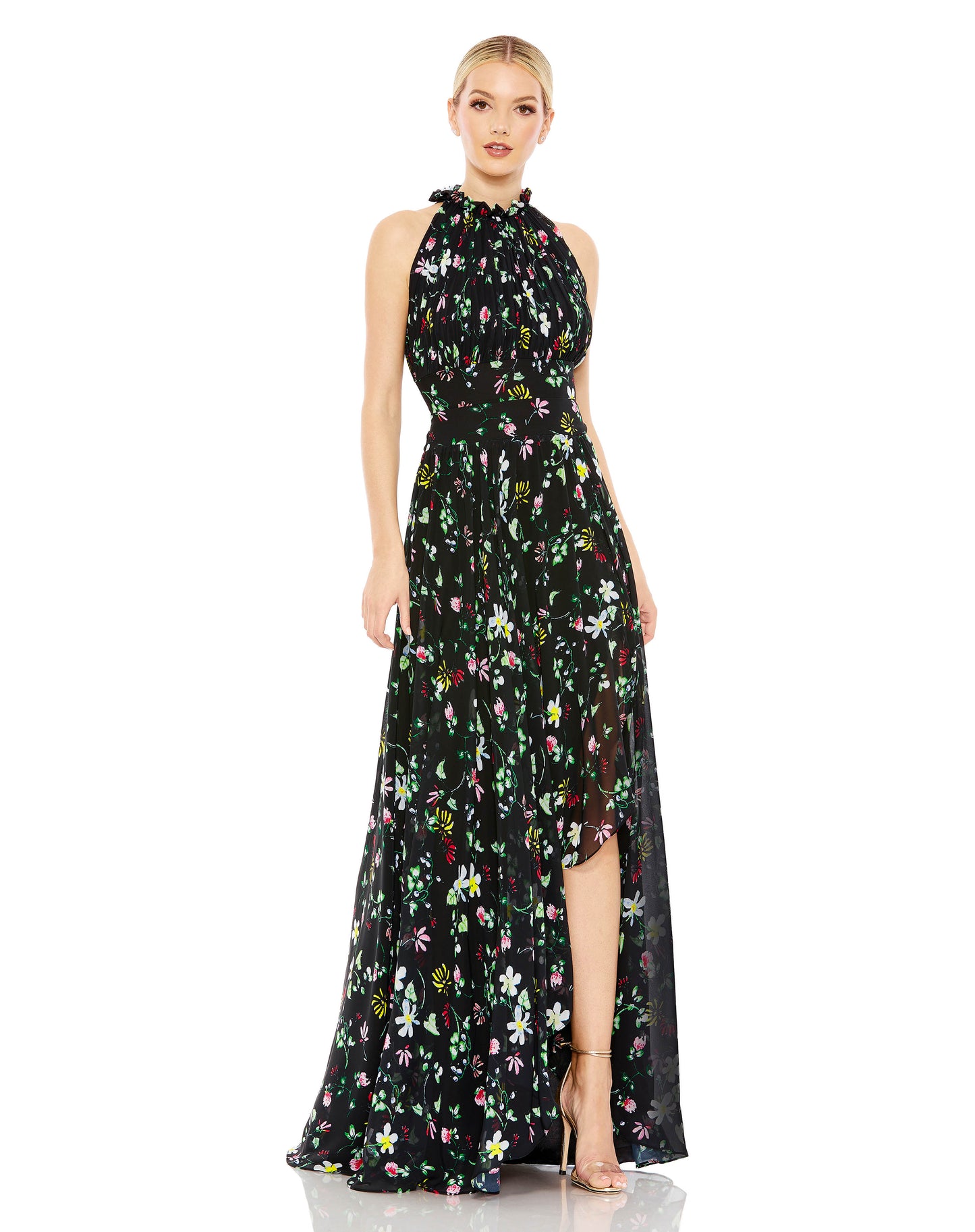 Mac Duggal 55648 This gown is styled in luxe chiffon, featuring a ruched bodice with a ruffle high neckline and keyhole back. A contour waistband cinches this sleeveless A-line dress, finished with an open front slit and a slight brush train.