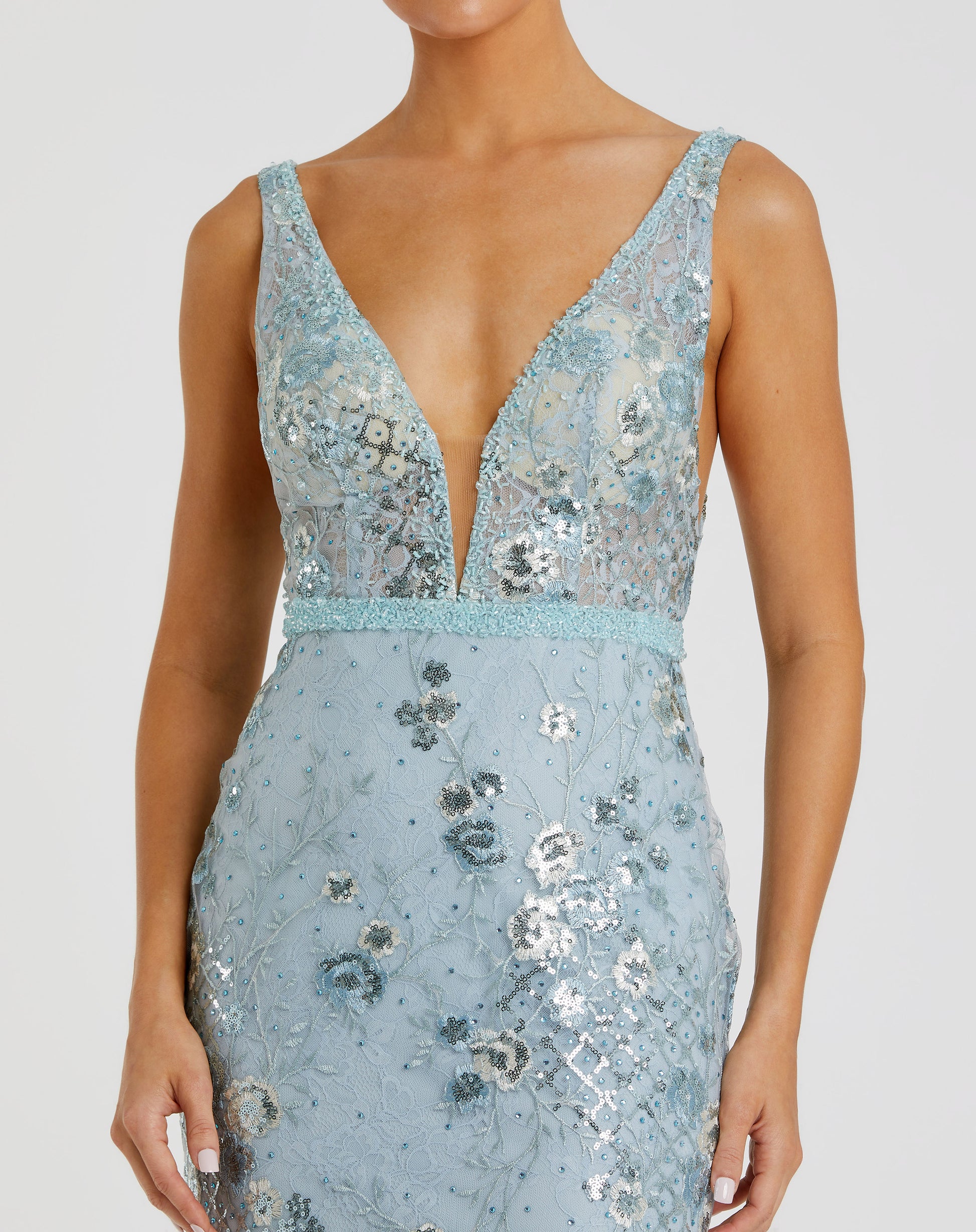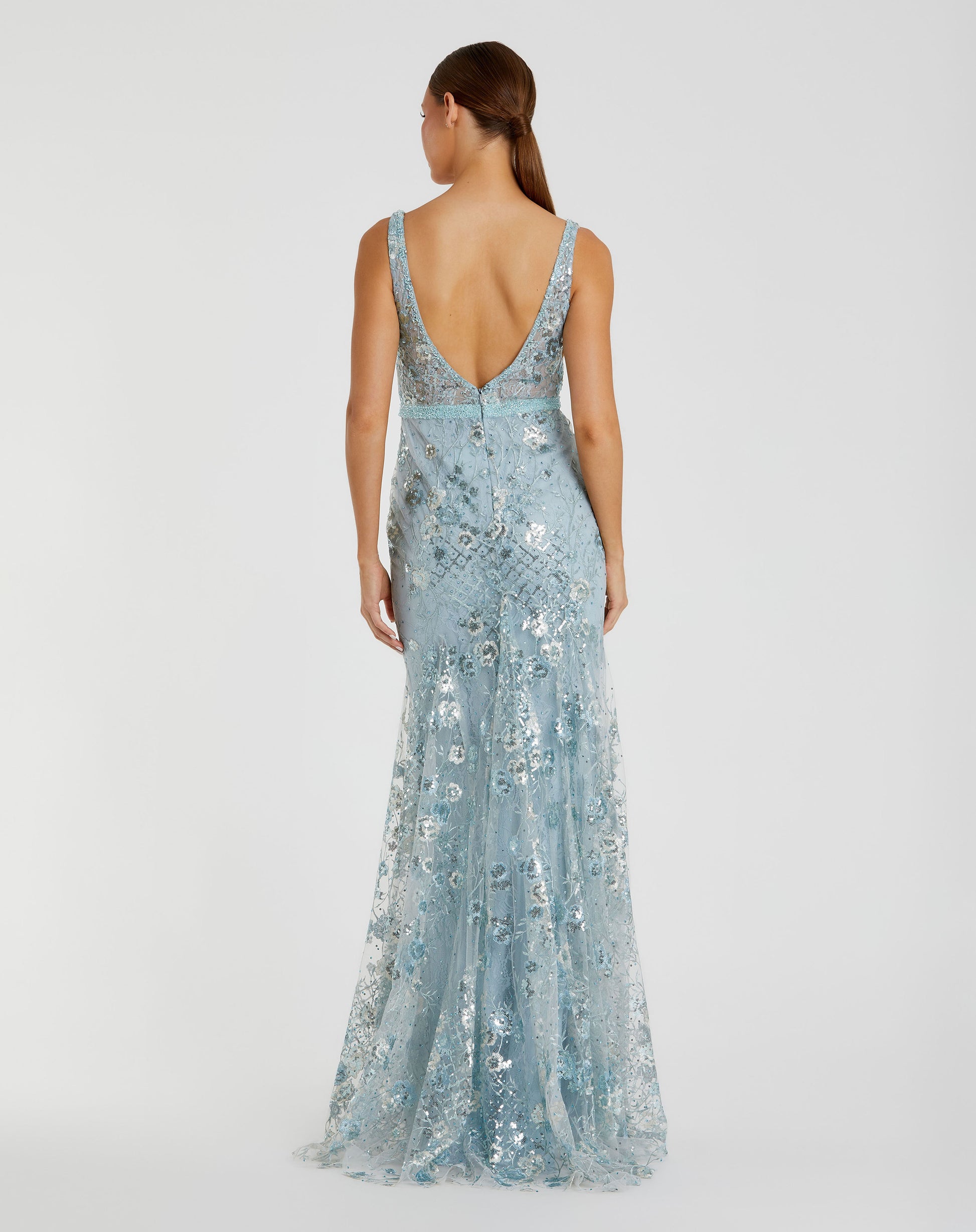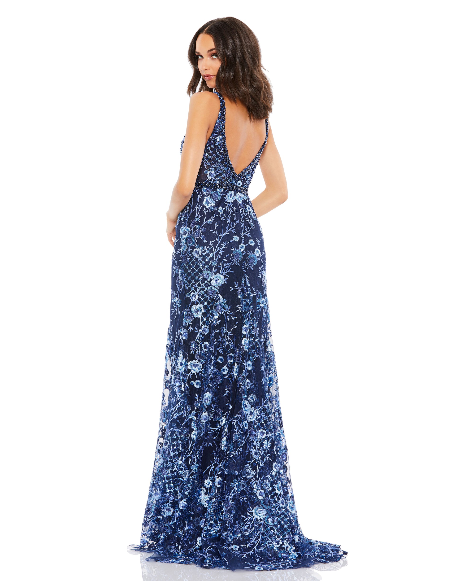This exquisite gown showcases delicate embroidered mesh adorned with intricate 3D floral appliqués and shimmering heat-set crystals. A hand-beaded waist belt adds refined detail, creating a harmonious blend of romance and sophisticated glamour ideal for unforgettable occasions.