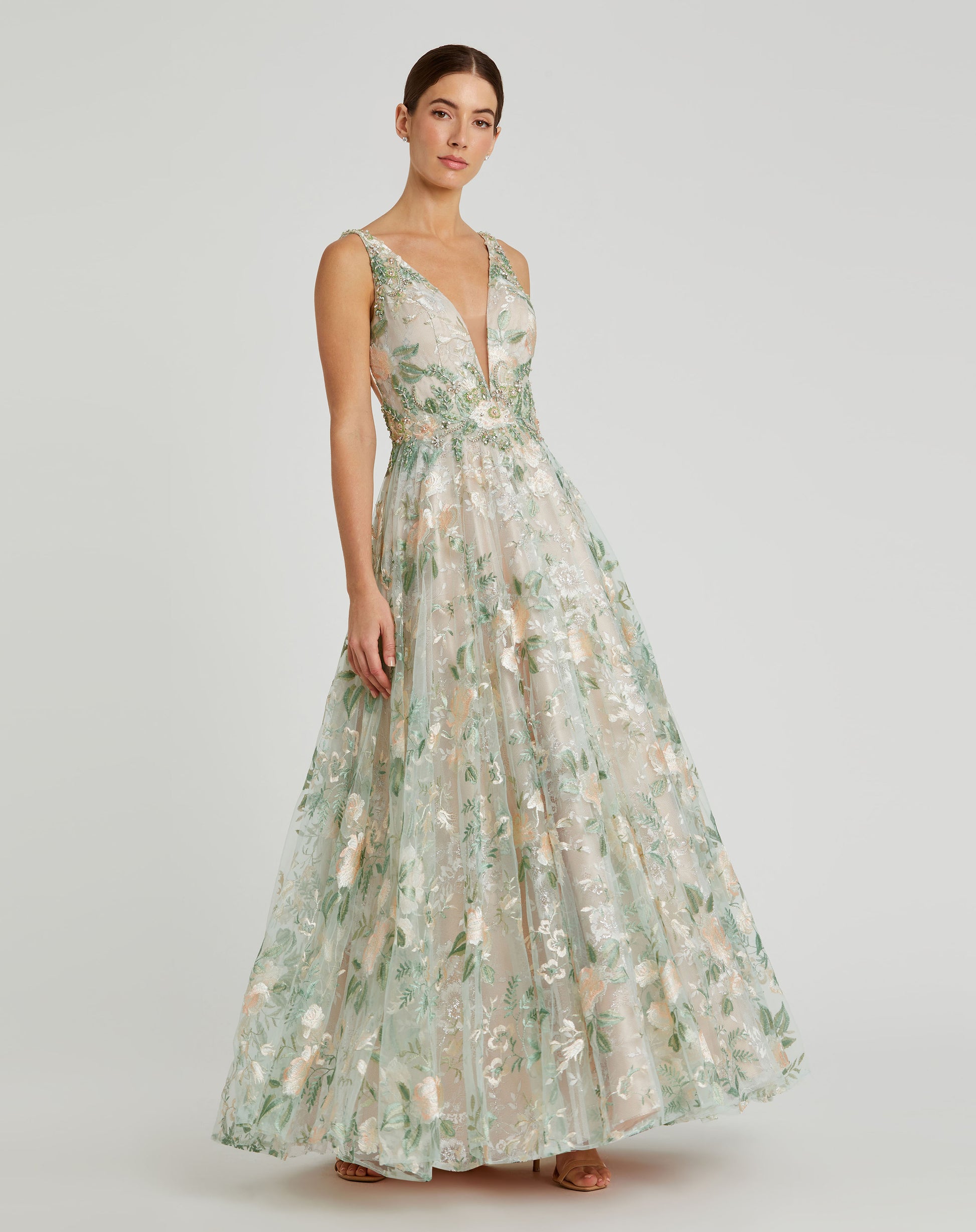 Elevate your style in our Floral Embroidered Illusion V-Neck Gown. Delicate floral embroidery and a flattering illusion V-neckline create a timeless and sophisticated look. Perfect for any fancy event or special occasion, this gown exudes a romantic and ethereal charm sure to make a lasting impression.
