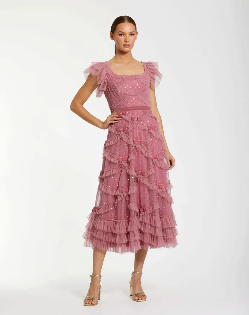 Discover elegance, sophistication, and style with the Mac Duggal 8272 Dot Net Sequin Ruffle Midi Dress. Featuring flutter sleeves and a square neckline, this dress also boasts a stunning dot net sequin ruffle design. Perfect for a special occasion, this dress will make you stand out from the crowd.