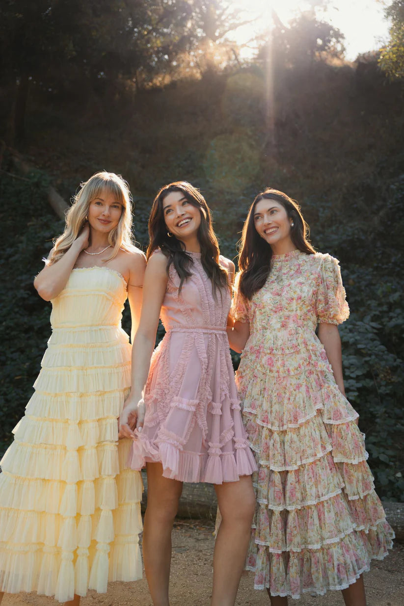 Indulge in romantic elegance with the Beige Lace Trim Printed Mesh High Neck Midi Dress. The illusion high neckline and delicate lace trim add a touch of sophistication, while the floral print and cascading ruffle detailing exude femininity. Perfect for special occasions or chic daytime events.