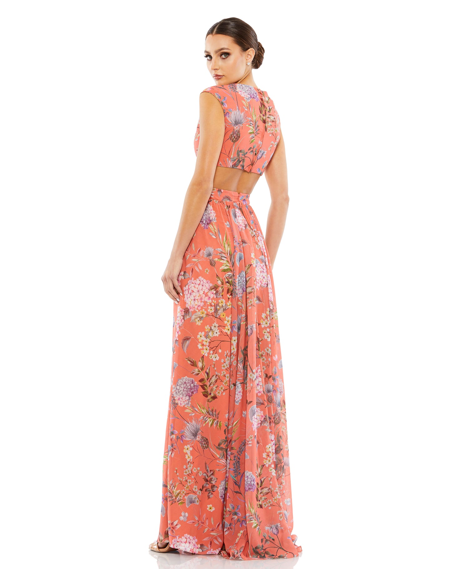 Mac Duggal 9154 Floral cut out cap sleeve v neck gown.